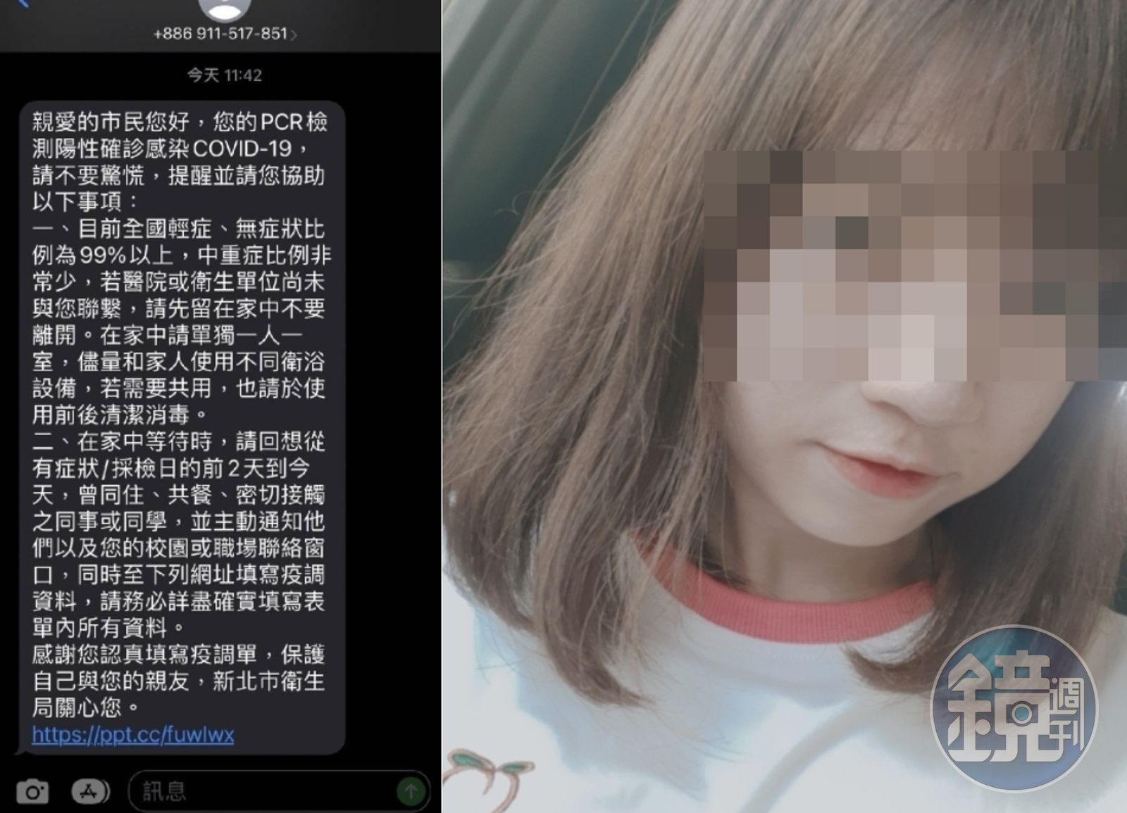 綠營新北市新莊區市議員擬參選人林秉宥28日在臉書分享,有確診民眾收到來自新北市衛生局的簡訊,內容除了告知PCR檢測為陽性,提醒居家隔離照護應注意事項,文末還附上一則短網址,請民眾協助填寫疫調資料,紀錄下過去的活動和接觸史。