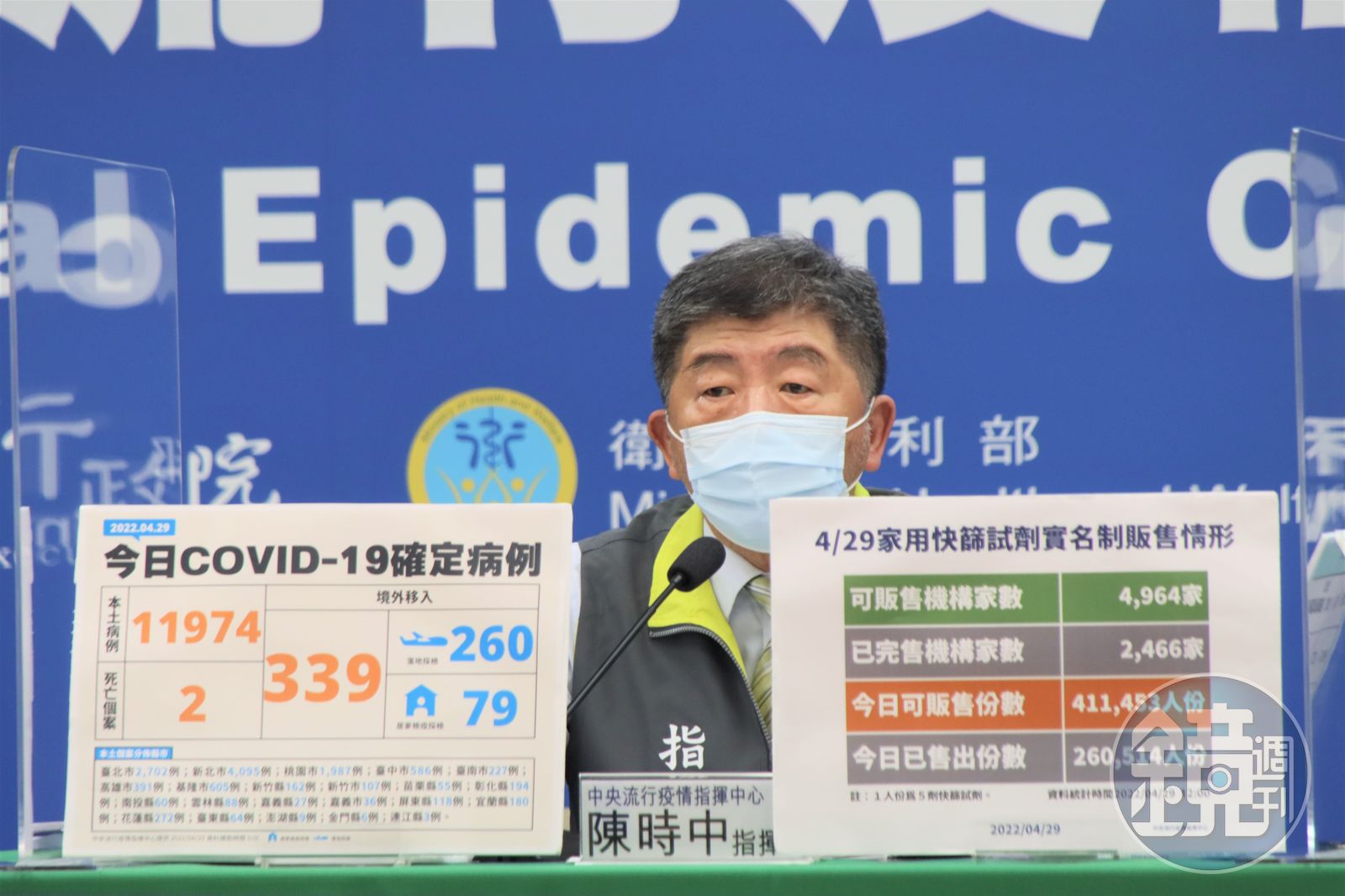 快篩實名制開賣第二天,今天輪到身分證尾數單號民眾購買,指揮中心表示,今天可販售數為41萬人份,可販售機構家數4,964家,到中午12點統計已售出26萬人份,已售完機構家數2,466家。指揮官陳時中表示,以昨天整體販售狀況數量來說,比較偏遠或遼闊的區域較不緊張,北部則相對緊迫,但大家放心,「每天都會有份數釋出。」