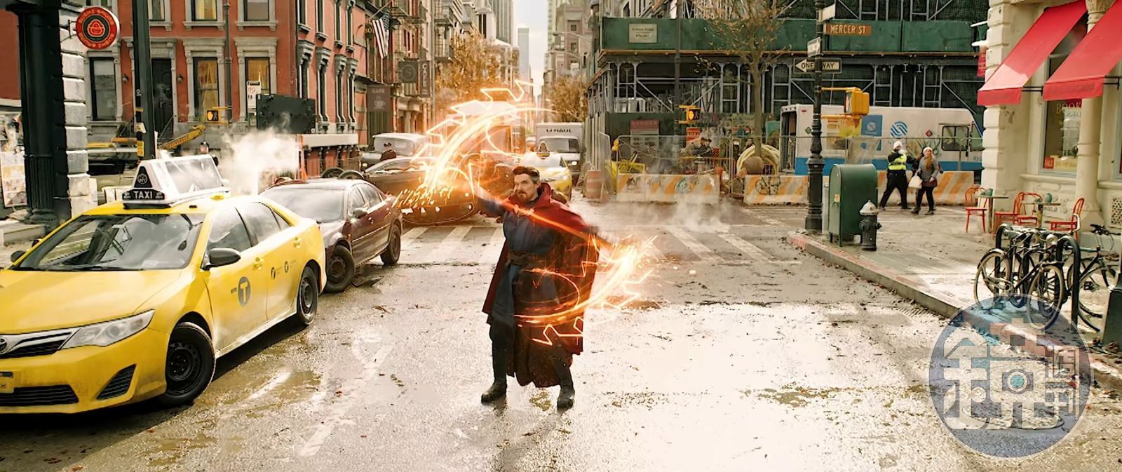 該則片段中,「奇異博士」史傳奇在大街上與反派章魚怪「Gargantos」對打,四周路人瘋狂逃竄,就在史傳奇準備施法出招時,鏡頭拉遠拍到街道上的擺設,一旁的垃圾桶擺著一個黃色報紙箱,上頭清楚寫著「大紀元時報」5個字。