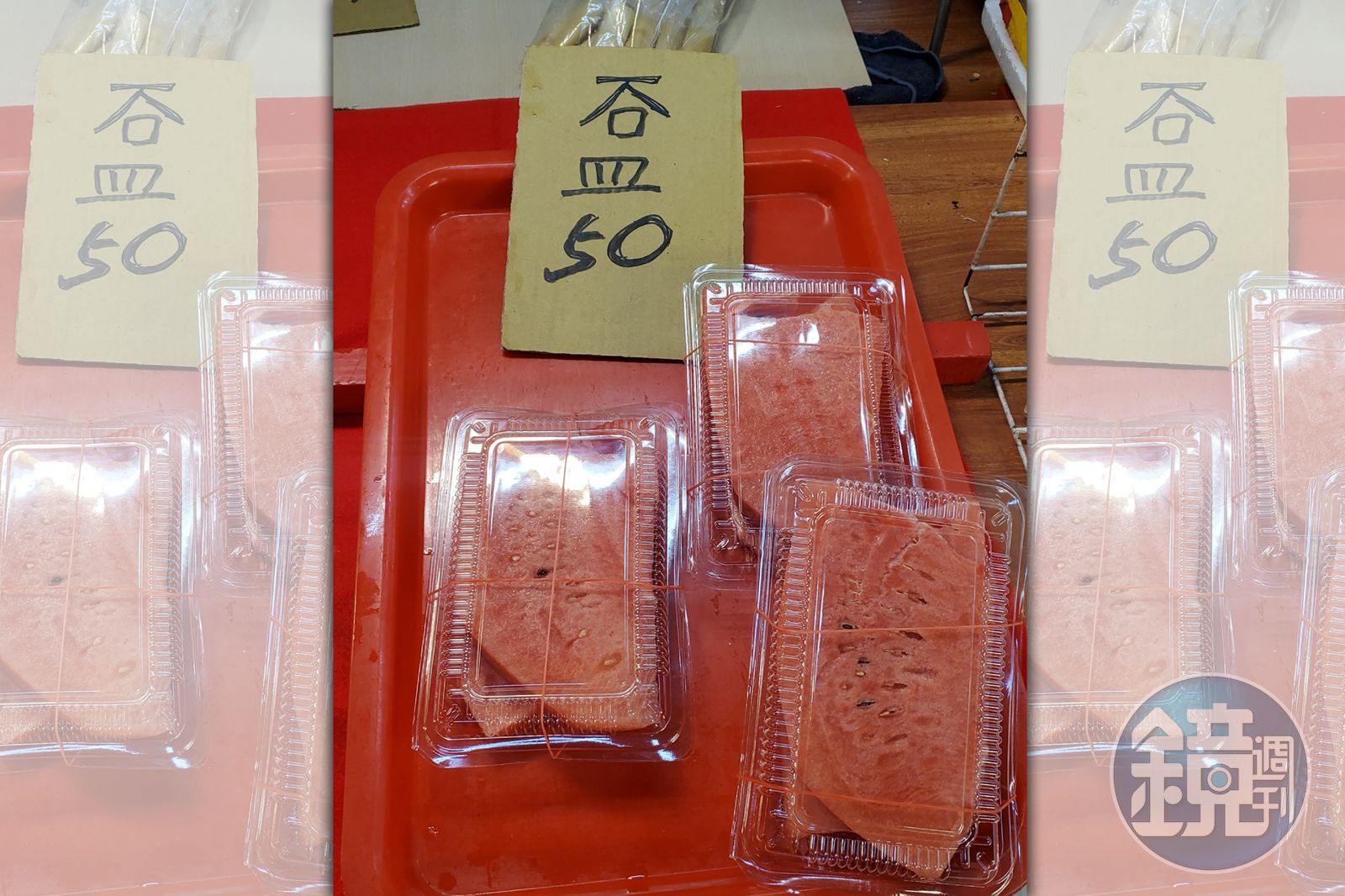 一名網友在臉書社團「爆廢公社公開版」PO出一張攤販賣西瓜的照片,並表示看到時「愣了一下」。只見照片中有3盒切好的紅肉西瓜,裝在透明塑膠盒中,上方擺著標價板卻寫著「一人口皿50」。