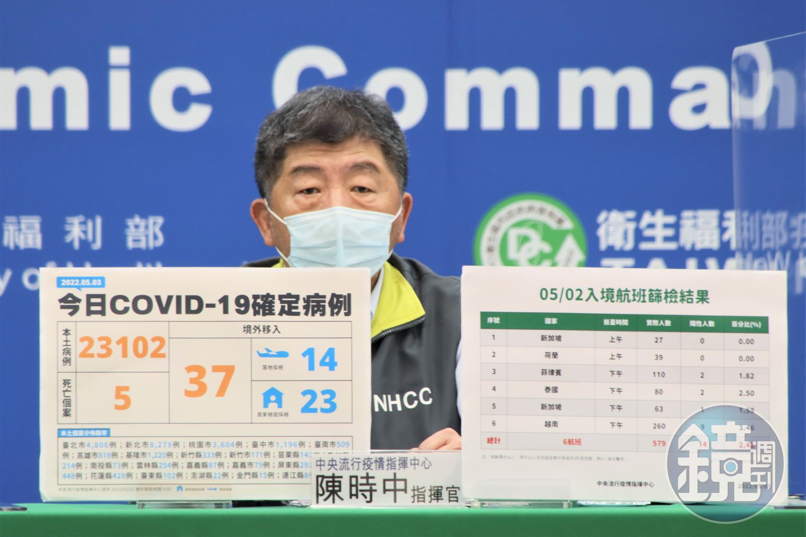 陳時中也宣布,5月9日起入境居檢天數縮短為7+7,即7天居家檢疫和7天自主管理,其中前7天內要篩檢2次,分別是第1次機場做PCR,第2次為第7天解隔前做快篩,中間若有症狀也可使用快篩,陽性就要通報。而檢疫還是以一人一戶為原則,否則就要進入防疫旅館。