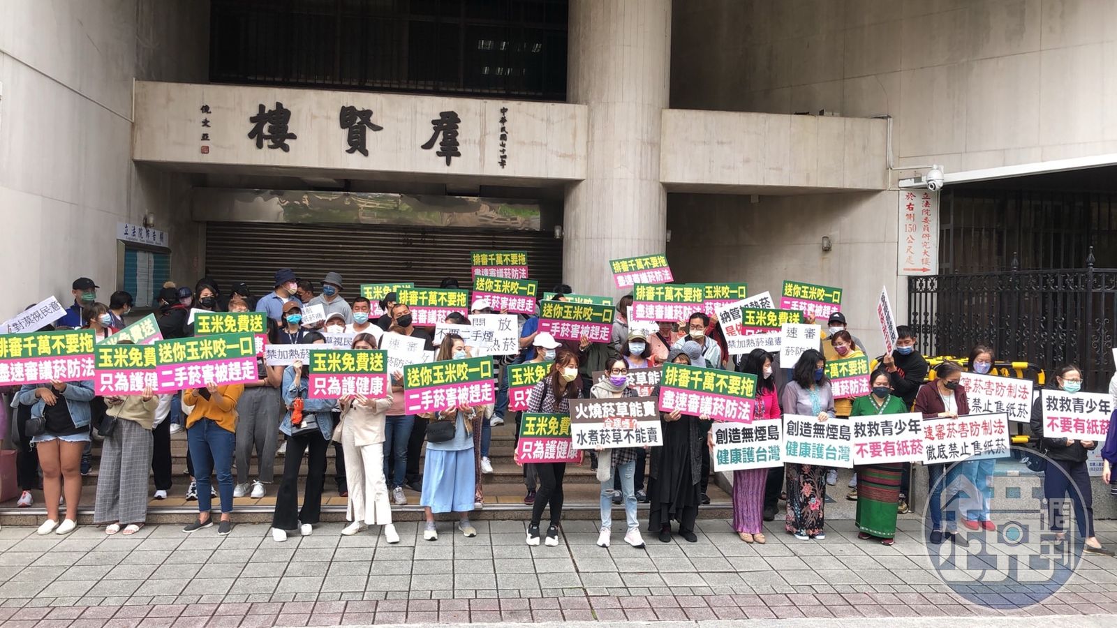 百餘名網友高舉「火燒菸草能賣,水煮菸草不能賣,合理嗎?」「送你玉米咬一口,二手煙害被趕走」的標語和大型的簽名布條,要求排審千萬不要拖,並向立委嗆問:「為何燃燒的菸草(紙菸)可以賣,水煮的菸草(加熱菸)不能賣?」