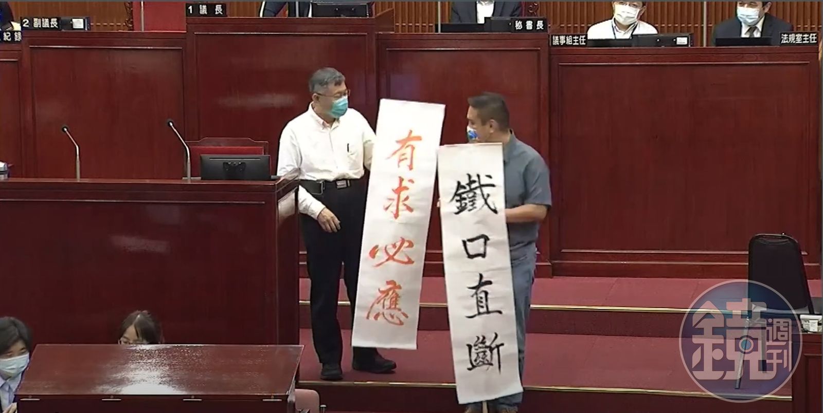 陳重文質詢最後也呼籲市長,在疫情關鍵時刻應該要有「有求必應」的心態,關懷不知所措民眾,隨後陳還親自送上寫有「鐵口直斷」「有求必應」的2面旗幟,期許柯文哲能夠盡量做到。