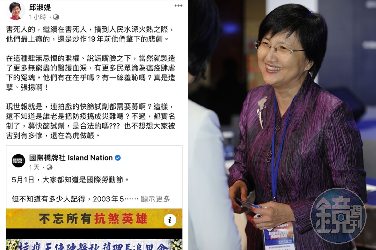 SARS時期擔任台北市衛生局長的邱淑媞被許多人點名是造成封院亂象的代表人物之一,不過她竟在自己臉書分享該則貼文,並發文寫道:「害死人的,繼續在害死人,搞到人民水深火熱之際,他們最上癮的,還是炒作19年前他們肇下的悲劇。」