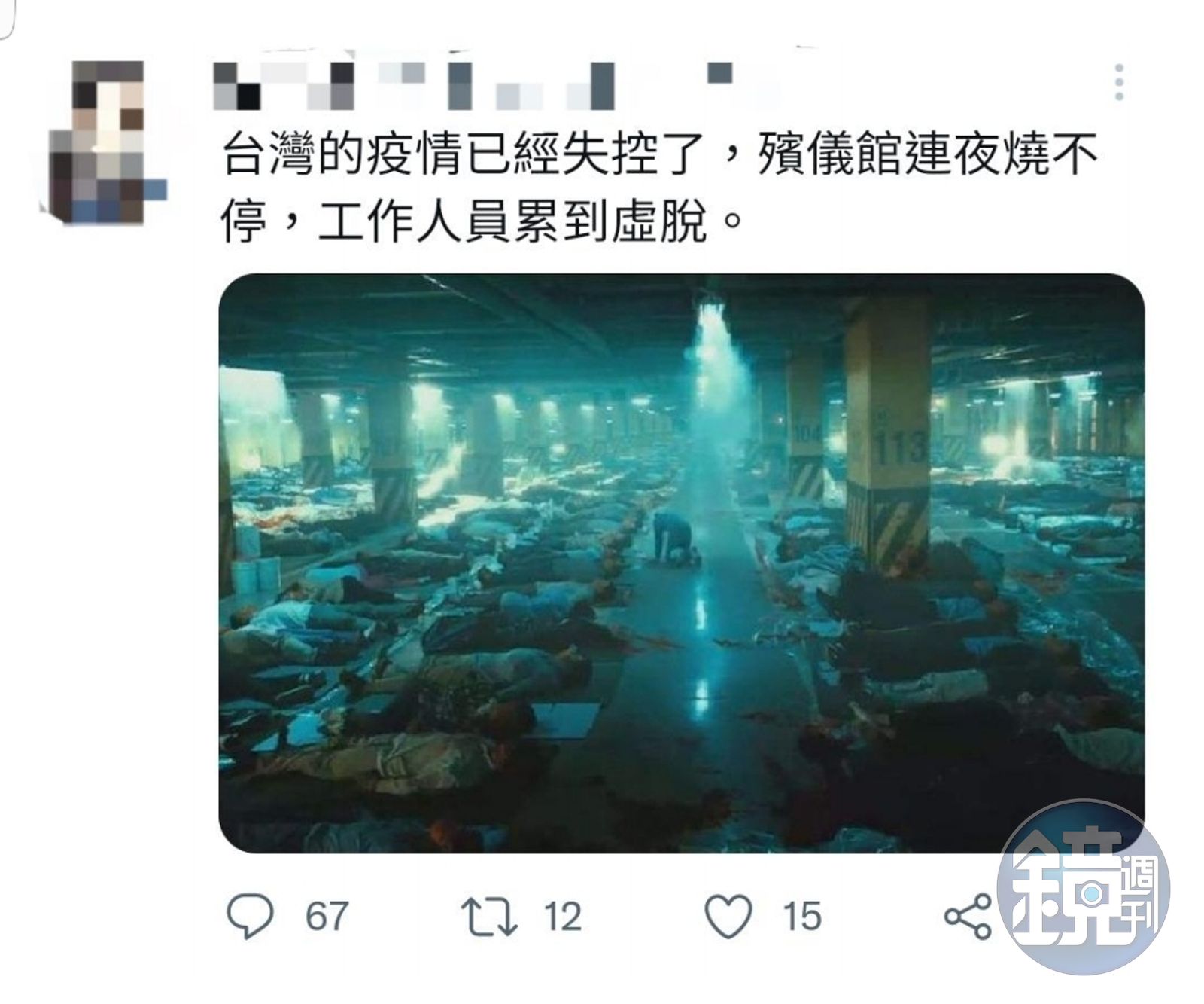 該篇不實網路訊息提到,「台灣的疫情已經失控了,殯儀館連夜燒不停,工作人員累到虛脫。」,並附上地面滿布屍體畫面的圖文訊息,企圖誤導民眾、引發社會恐慌。