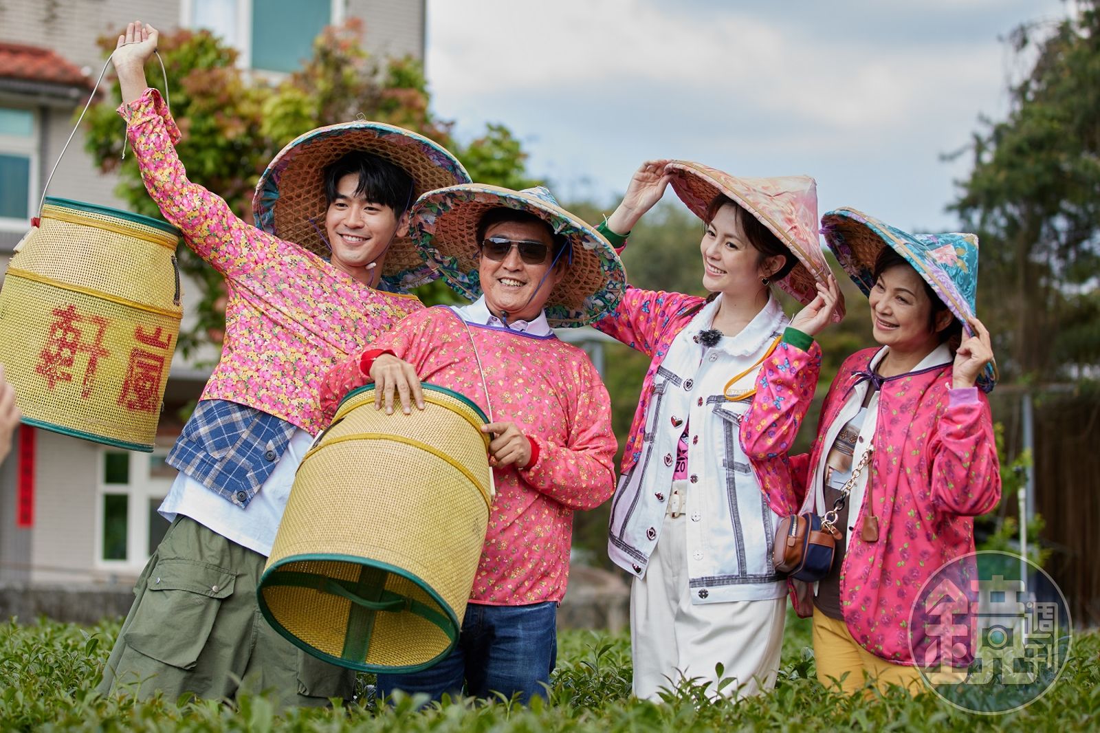 楊貴媚(右1)、檢場(左2)、任容萱(右2)、涂善存(左1)出外景體驗採茶文化。(東森提供)發布時間:2022.05.09 15:39 臺北時間