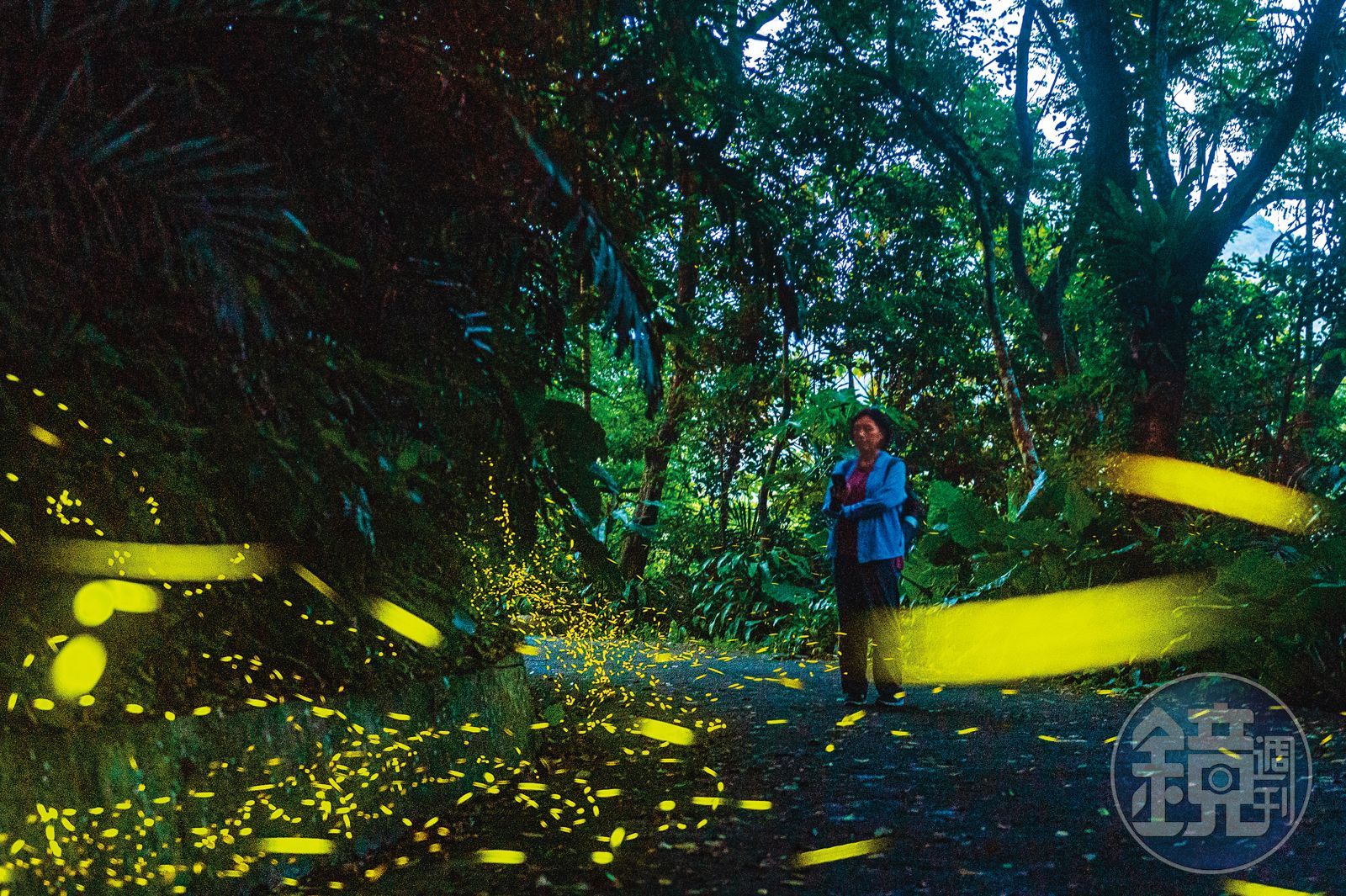 吃飽喝足,天色也漸暗,此時先進行簡單的螢火蟲生態認識與解說,晚上7點一到,大家開始沿著步道而行,待眼睛慢慢熟悉黑暗後,馬上發現路旁草叢全是螢光點點,再往裡頭的水稻田區及土角厝看,整片螢光從路邊低處延伸至整面山壁,讓大家既驚嘆又安靜地沉醉在「螢」河之中,不捨離去。