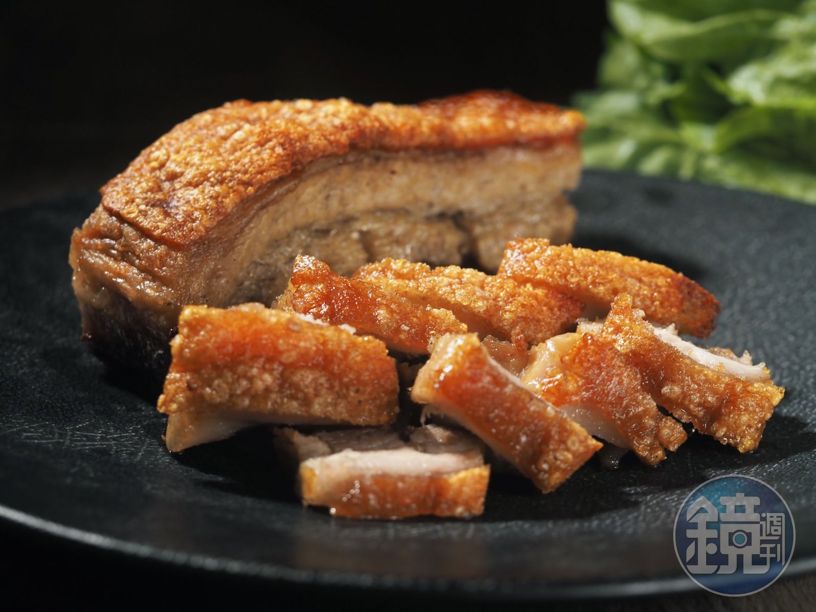 烤好的脆皮燒肉,用刀刮表皮應該會有悅耳的酥脆聲響,從烤箱拿出來後,要先放涼再切,以免肉汁流光。豬皮硬脆且滑,從上方下刀容易滑刀,可以從側面下手,先輕輕劈出裂口再切,就可切得安全又漂亮。醃過一晚的豬肉已經很入味,不用蘸醬也相當下飯,最重要的是,自己做出有如店裡賣的成品,那股成就感,無價。