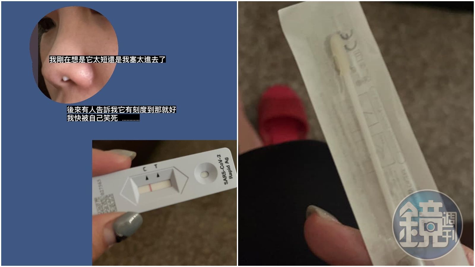 一名女網友9日於臉書社團「爆廢公社」貼出自己做快篩的照片,發現她幾乎把整根快篩拭子塞進鼻子裡,僅留下一小段白色的拭子,她既納悶又好笑地說「我剛在想是它太短,還是我塞太進去了」,事後才知道將拭子塞到刻度處就好,不過也安慰自己「那麼深,測起來應該是準的吧」。