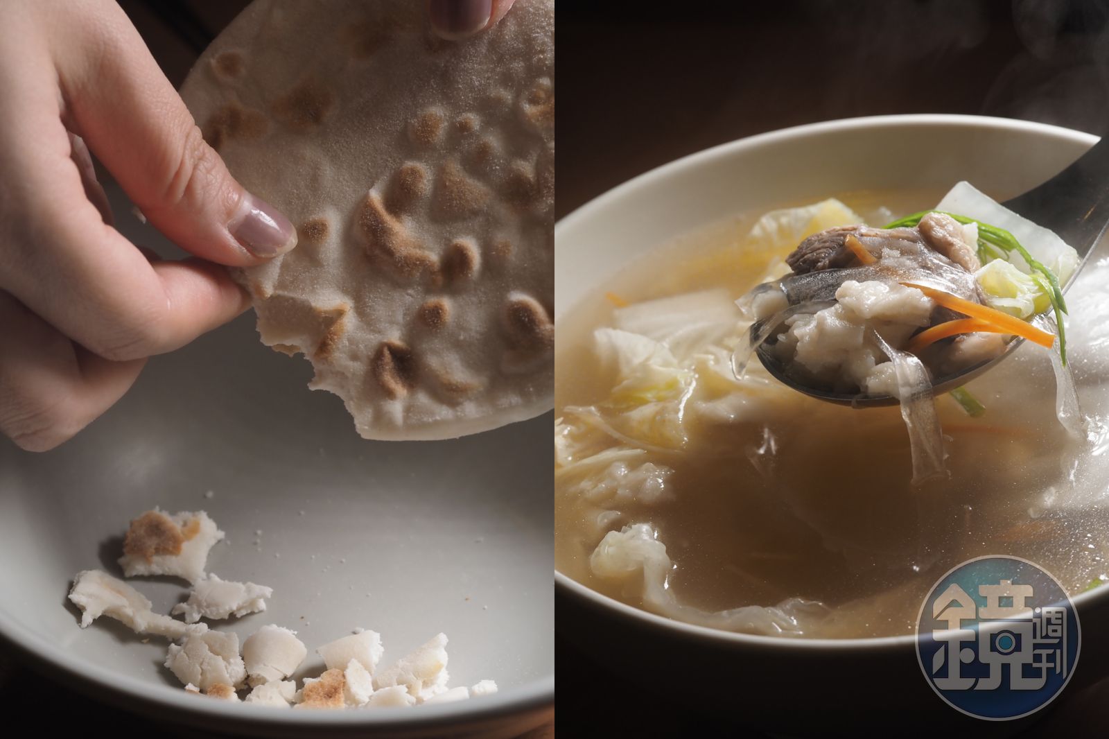 在台灣最有名的陝西菜,當屬羊肉泡饃了,雖說泡,但其實是用羊肉湯煮饃,所以用於泡饃的饃,得用不發酵的半熟麵餅,稱為「坨坨饃」,才能保持Q滑的口感。吃羊肉泡饃有趣的是,食客要自己把饃餅掰成小塊,再送進內場讓廚師煮,所以想吃什麼口感的泡饃,全看個人手藝,一般而言,饃掰得越大塊,湯就得越多,才能煮得透。而掰饃這種機械式的動作,也很適合在等待上菜時打發時間。