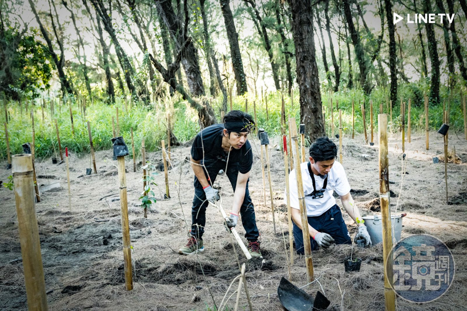 陳柏霖在《極島森林》除了夜晚和好友們體驗野營的箇中滋味,白天跟隨專業職人的腳步,踏上探索土地的旅程,相當寓教於樂。陳柏霖與劉冠廷共同前往台江國家公園,在職人的帶領中種下樹苗,守護海岸線生態,兩人搬了300公斤的樹苗和土,一一親手種下,劉冠廷執著認真的模樣,相當迷人,但兩人也不約而同嚷「我們是來做苦力的」。