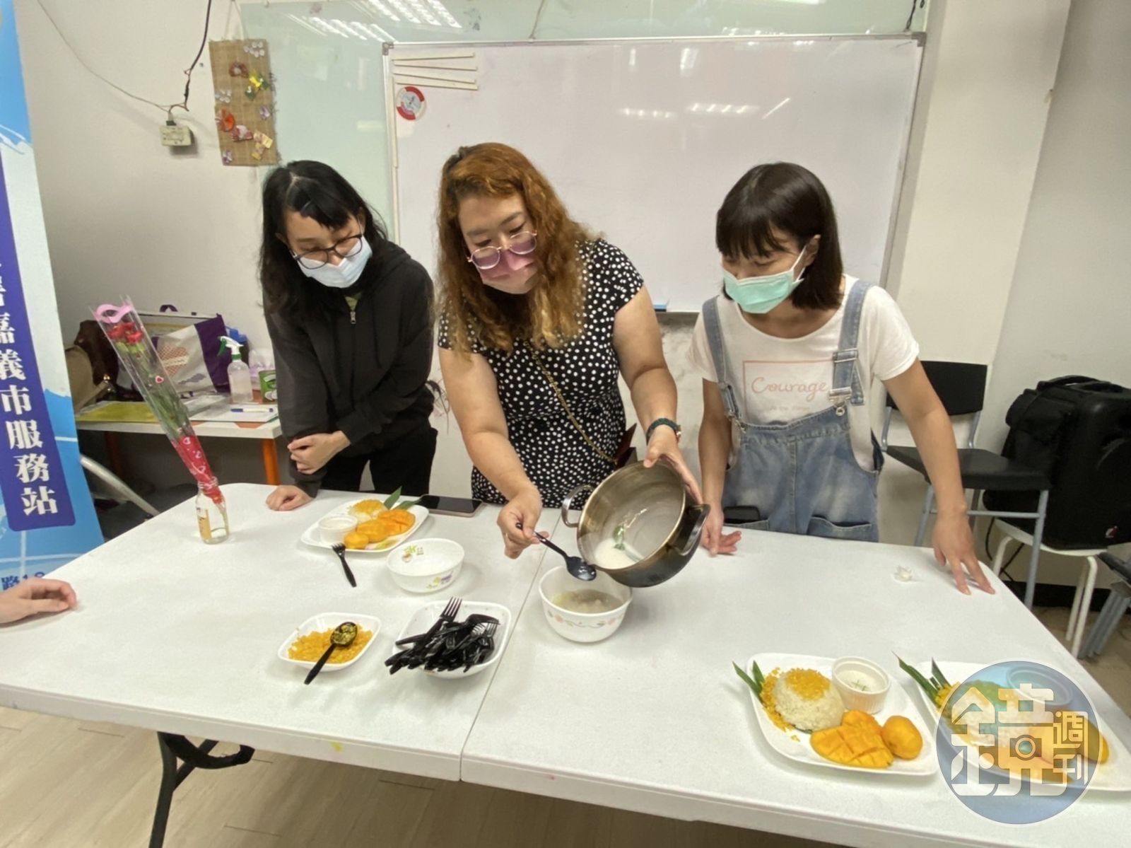 泰國籍講師娜芈說,「芒果糯米飯是泰國經典的甜點,食材包含芒果、糯米、椰奶、綠豆仁及香蘭葉,好吃的祕訣在於糯米洗淨加入適當的水後要浸過夜,在蒸糯米時可放入1至2片的香蘭葉提香;另外製作椰漿時要以慢火加熱,看到鍋邊冒出小泡泡即可。將溫溫的椰漿拌入熱騰騰的糯米,糯米才能充分吸收椰漿的香甜」。