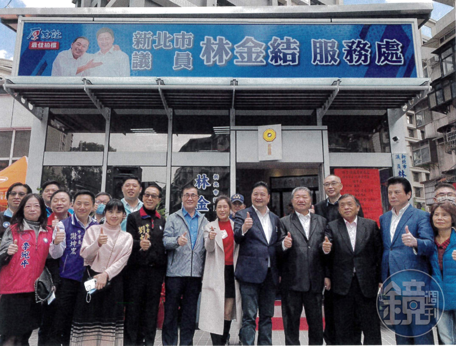 去年12月初,林金結在土城學府路二段的一處精華地段,舉辦了「新服務處剪綵、安座儀式」,該活動包括新北市副市長謝政達、高雄市前副市長李四川等人均到場祝賀,謝政達還對媒體稱:「這個服務處建築很特別,原來是樣品屋!」林金結當時也表示,一切都已向工務局合法申設,將在此持續服務民眾。