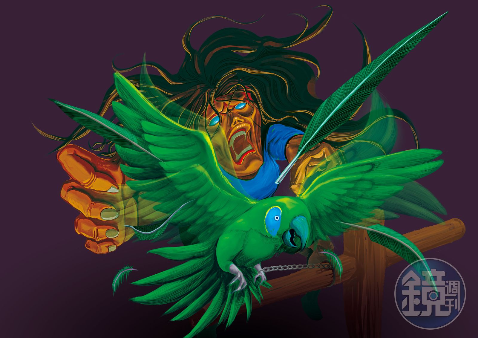 當時,素麗低沉的喘息聲帶點粗糙的喉音,啪啪啪啪,傑克的亮綠色翅膀在空中激烈擺動,抖下不少羽毛飄著,東毅就這麼盯著傑克上下飛跳,但隨著牠右腳踝上的鐵鍊被素麗緩緩鎖緊,晃動的幅度慢慢縮小,終於被素麗抓在手上。素麗一手掐著傑克的脖子,另一手逐一扣住兩隻翅膀,傑克死命扭動著頭想啄素麗的手,卻只在虎口處啄出一個小洞後,整顆頭骨被扣住無法動彈。