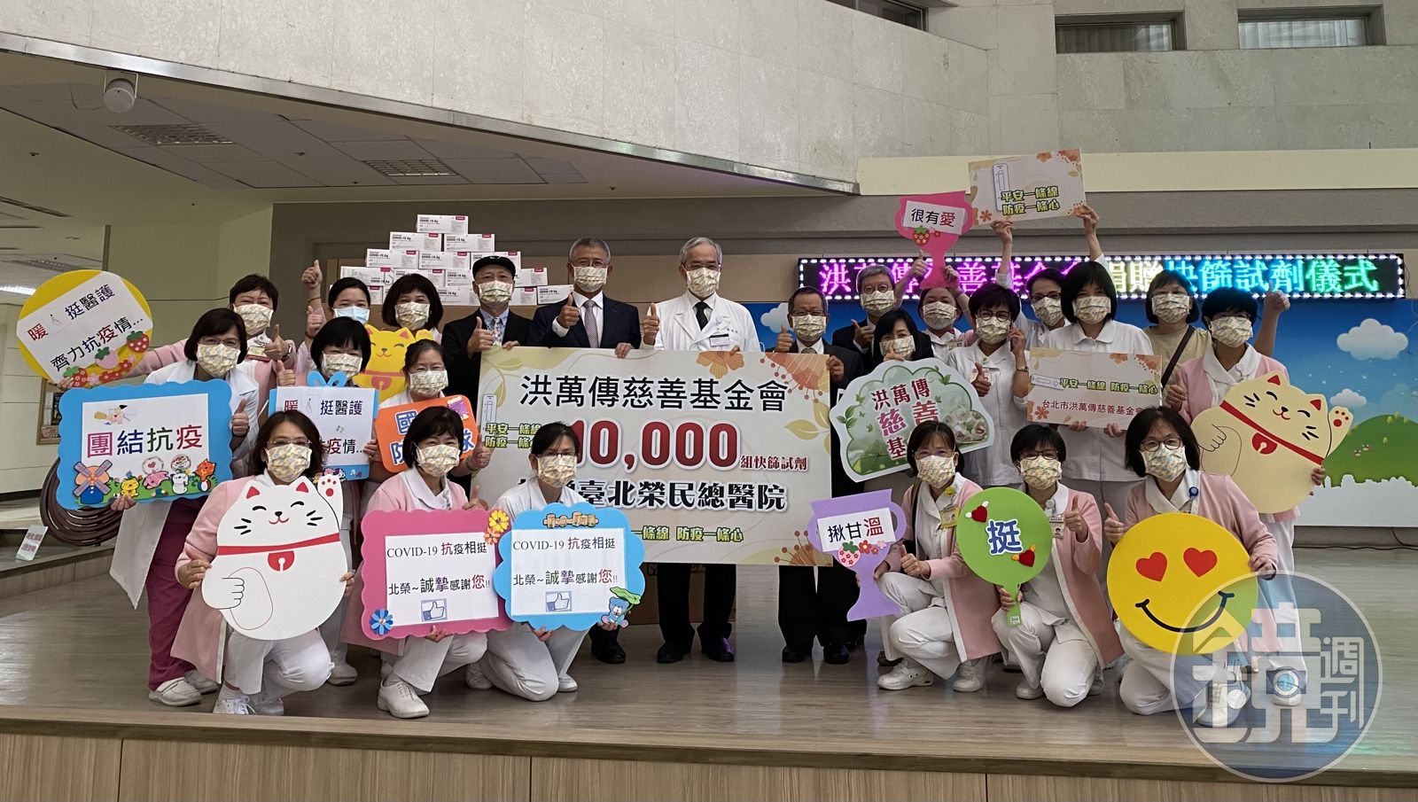 洪萬傳慈善基金會捐贈一萬份快篩試劑予臺北榮民總醫院,協助提升防疫量能。(洪萬傳慈善基金會提供)發布時間:2022.05.20 15:44 臺北時間