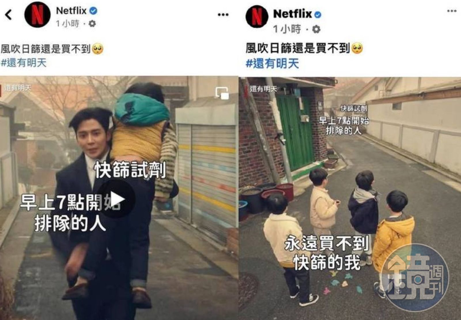 台灣Netflix上週末為宣傳新劇,擷取韓劇《還有明天》畫面為素材,搭上國內時事製成哏圖,附上文字描述情境「風吹日篩(曬)還是買不到」,並呼應劇名稱買不到「還有明天」,加註 「早上7點開始排隊的人」扛走「快篩試劑」,原地的人則寫上「永遠買不到快篩的我」,與所有哏圖一樣,以玩笑方式反映國內近來快篩試劑供不應求的事實。