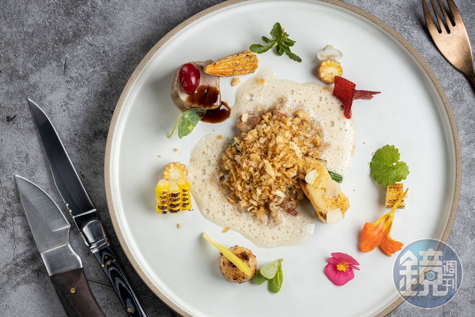 呈現各式食材玲瓏姿態的還有「這是Corn版本3.0,夠了!」玉米蛋糕、玉米、玉米筍、玉米苗、爆米花醬汁與秋海棠、金錢薄荷、金蓮花、馬齒莧同台,讓你自由搭配探索,一時間還以為自己是誤闖私人花園的植物學家。「醃漬花椰菜在塔中」複製搭乘火車旅行時,窗外望去盡收眼底的綠油油山巒,點綴在花椰菜山的驚喜是真的螞蟻,咬下小小黑色身軀,與發酵大蒜炒花椰菜泥入口,淡淡酸韻平衡上一道的飽滿肉感。