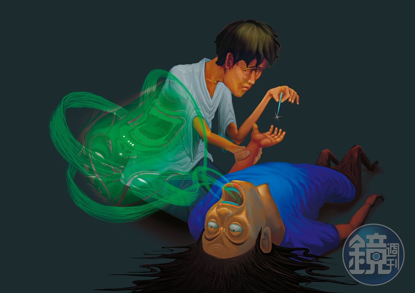 東毅拚命搖頭,汪昊則根本沒有要管東毅的回應,凝神看著素麗,左手壓在素麗左臉上,拇指掐進人中,右手的鋼針朝著腦門微微斜上,尖端抵著凹陷處,在素麗吐出下一口氣時,整支針順著吐氣的節奏刺進去,但奇怪的是,東毅感覺汪昊輕鬆得就算把手放開也能繼續進針,那針像是被腦門渴求地吸進去一樣。素麗雙眼皺了一下,看起來還能忍受不適。