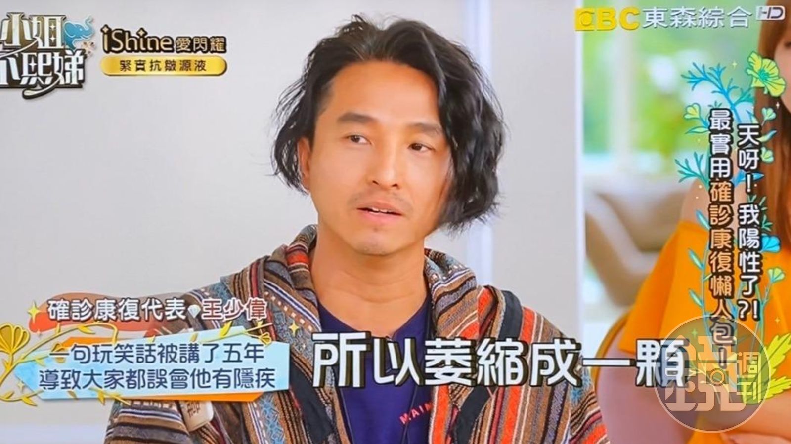 如今王少偉終於能夠上節目當面澄清,他說,當初是在綜藝節目上被虧,因為太久沒開機,蛋蛋萎縮只剩一顆,想不到一句玩笑話就傳了5年,他說:「我是綜藝節目的受害者」,同時也感謝許藍方幫忙澄清。
