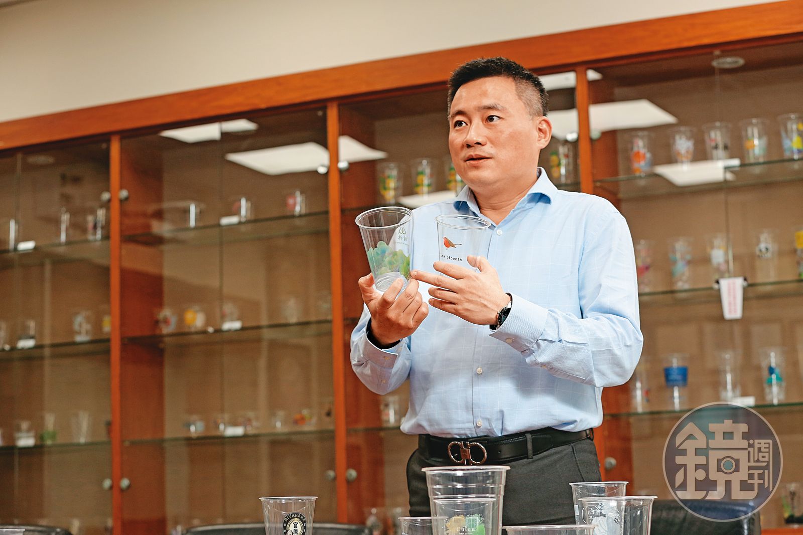 從第一個客戶摩斯漢堡,再到哈根達斯,以及各式鮮果汁、咖啡品牌,如今瑞興相關產品已達上百種,一年出貨的杯子就高達13億個。「包材是長期可做的生意,現在我們營收外銷佔70%,倘若台灣需求持續萎縮,或許未來瑞興100%都做外銷。」
