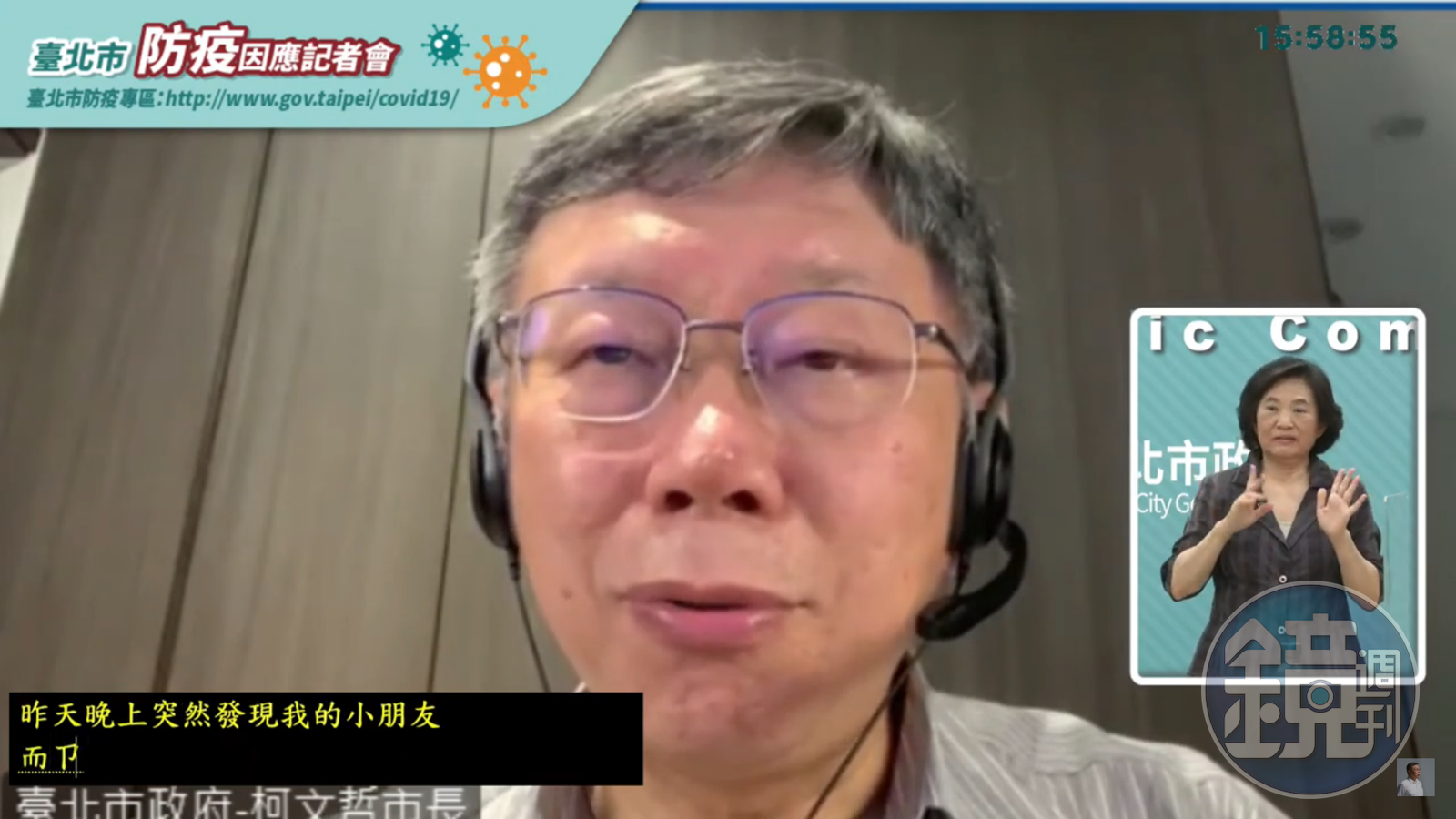 日前確診的柯文哲今(26日)透過視訊參與台北市防疫記者會,被記者問到本來住在朋友家進行居家照護,為何忽然又回到家了? 柯文哲表示,昨(25日)晚突然發現兒子、女兒都快篩陽性,兒子還發高燒送急診,PCR也是陽性,「我們家5個人有3個人感染,剩下陳佩琪還有1個女兒沒感染,她們都去外面住旅館,那我們這些剩下感染的全部回來。」