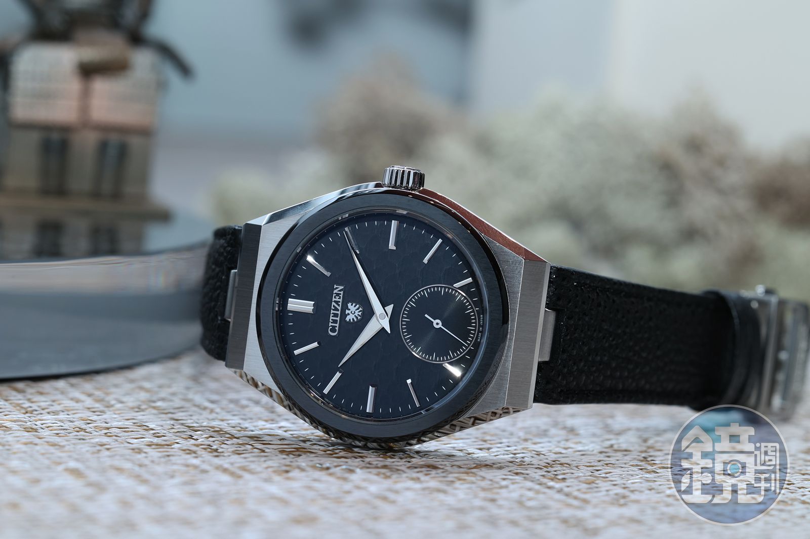 今年的重頭戲是這款The CITIZEN的NC0206-18E「黑魂甲冑限量款」腕錶,靈感來源是日本傳統武士的甲冑,CITIZEN選擇使用電鑄工藝打造出獨特的錘紋飾面,帶有類似錘擊金屬的波動紋理,也因為要在面盤這麼小尺寸的部件上呈現出紋路,頗考驗品牌的製作技術力。同樣取經自武士甲冑的設計元素還有錶帶,不同於高級鐘錶中常見的鱷魚皮錶帶,NC0206-18E採用了相當特殊的姫路黑棧革(Himeji Kurozan)皮革材質,它完全由人手製作,結合了傳統鞣製技術和塗漆技術,皮革的表面上有著細小的顆粒紋路,除了富有光澤質感之外,更有高耐磨性,據說姫路黑棧革在戰國時代被用於製作鎧甲上。透過以上兩個部件的特殊設計,將把日本傳統意象導入到錶款之中。