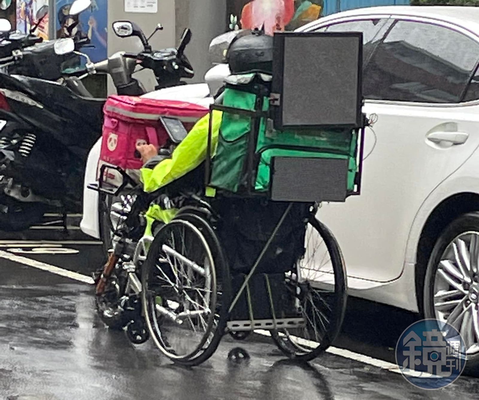 一名網友26日於臉書社團「信義兩三事」貼出一張照片,只見一名坐在輪椅的外送員,在雨天中仍努力送外送,從曝光的背影中可見,該名外送員的輪椅上放著Foodpanda及UberEat兩間外送的袋子,而手機則架在正前方,即使下雨也努力穿梭在大街小巷送外送。
