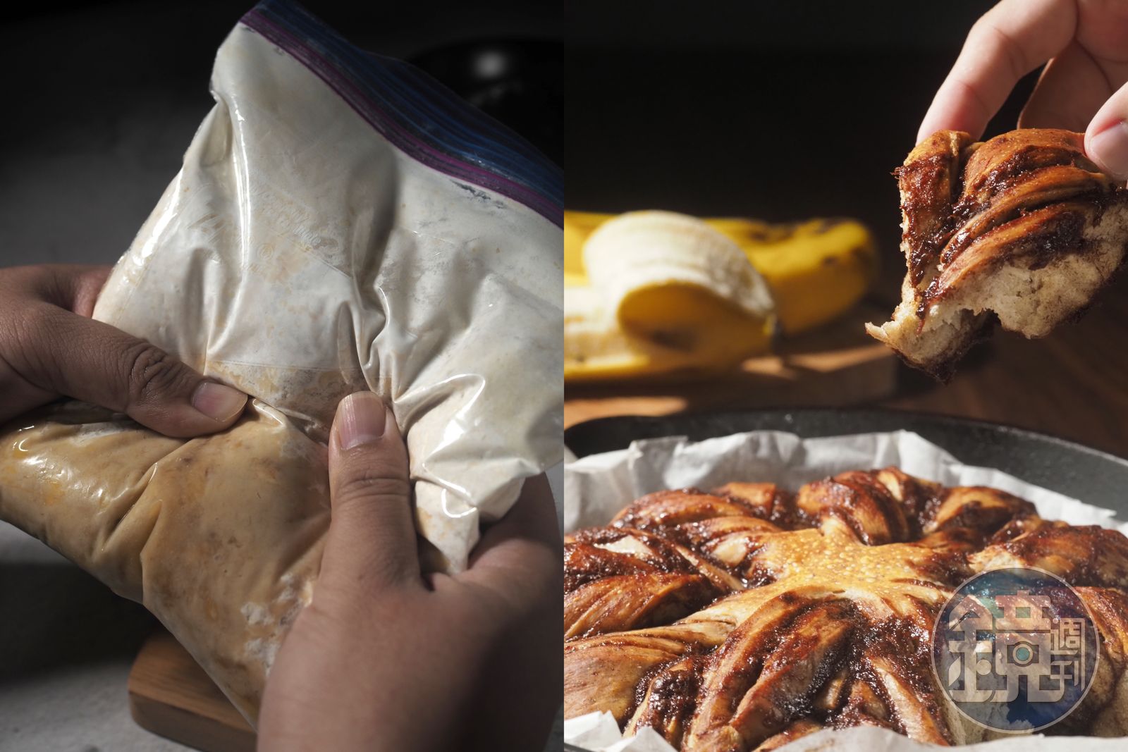 用保鮮膜或鍋蓋罩著盆子,避免麵糰失水,放在溫暖處大約1小時,或者等麵糰發到約兩倍大。這時可以先來做餡料,香蕉跟巧克力是經典組合,所以這次做個香蕉巧克力餡。另外取100克香蕉肉壓成泥,加上1大匙榛果巧克力醬拌勻,如果手邊沒有巧克力醬,也可以加沖泡式的可可粉。拌到呈現濃稠膏狀即可放著備用。