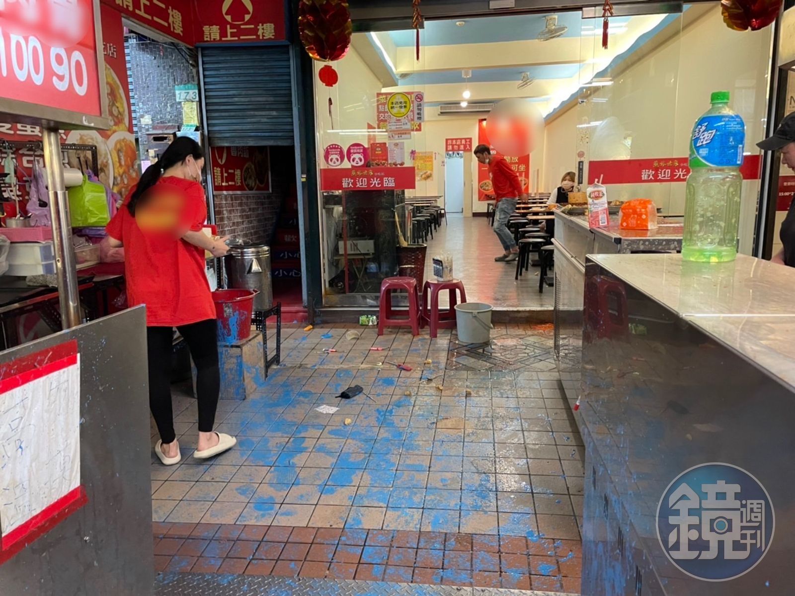 店家門口遭潑漆,地面都是藍色油漆。(翻攝畫面)警方主動介入追查,調出監視器畫面,發現4男犯案後分乘計程車逃逸,隔天清晨循線逮捕1名林姓男子(21歲),陸續通知其餘共犯魏男(25歲)、劉男(20歲)及許男(24歲)到案說明。