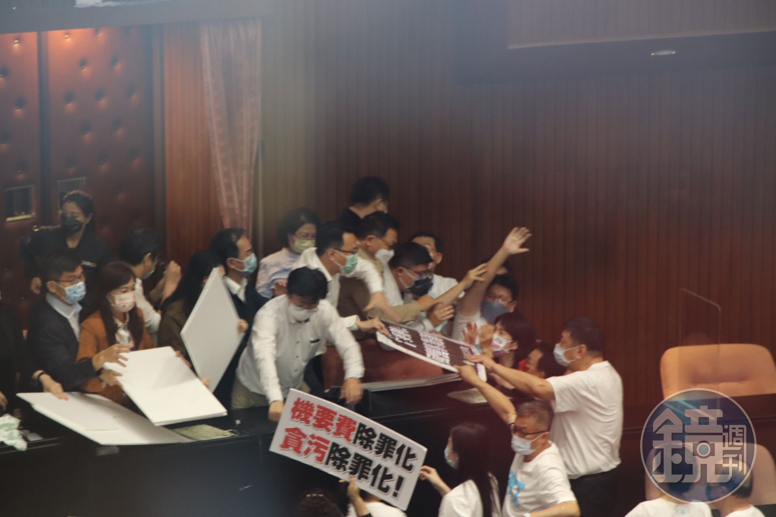 藍綠黨團為了《會計法》修法、將國務機要費除罪,一早就上演爭搶主席台大戰,雙方在主席台上發生多次推擠拉扯,甚至還有人掛彩濺血,場面相當失控。