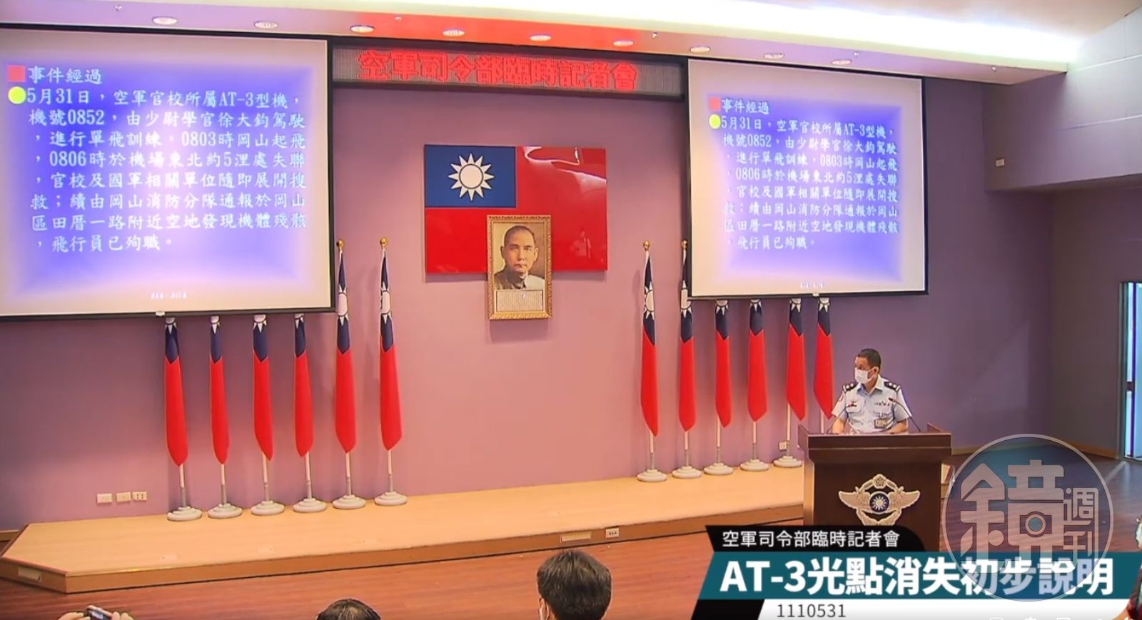 空軍司令部參謀長黃志偉中將今上午主持臨時記者會,說明AT-3墜毀事故的案發情況。黃志瑋還原事故經過,徐大鈞少尉為空軍官校110年班,飛行總時數116小時20分,AT-3機種時數24小時,體檢、航空生理及求生訓練均合格;今上午駕駛機號0852的AT-3進行單飛訓練,本次為他的第二次單機單飛,早上8時03分自岡山機場起飛後,8時06分即在機場東北約5浬處失聯,隨後岡山消防分隊8時11分通報在田厝里一帶尋獲機體殘骸,並發現徐大鈞遺體。