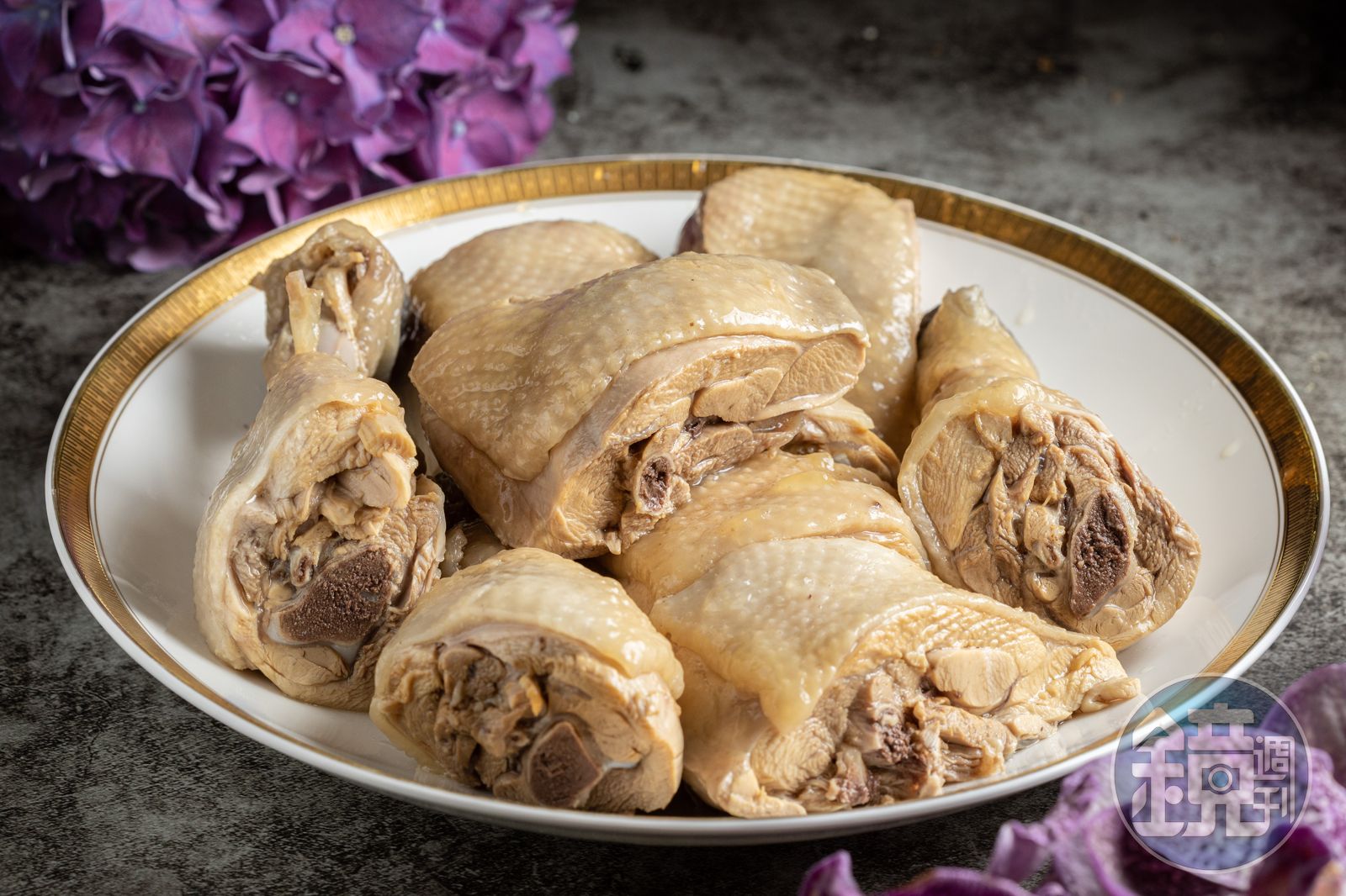 第二步是冰鎮。準備一鍋清水,倒入大量冰塊,然後將煮熟的雞腿放入冰水中冰鎮,如此一冷縮,可將雞肉的肉質維持在最鮮嫩狀態。第三步是調醉汁。將煮雞腿的原鍋湯汁,以一兌一的比例加入紹興酒。我這次用4支雞腿,所以只要一瓶紹興酒,同比例的雞湯即可蓋過雞腿。這鍋醉汁唯一的調味料是鹽。要加很多鹽,嘗一下醉汁,要過鹹才可以,否則醃出來的醉雞味道會不夠。
