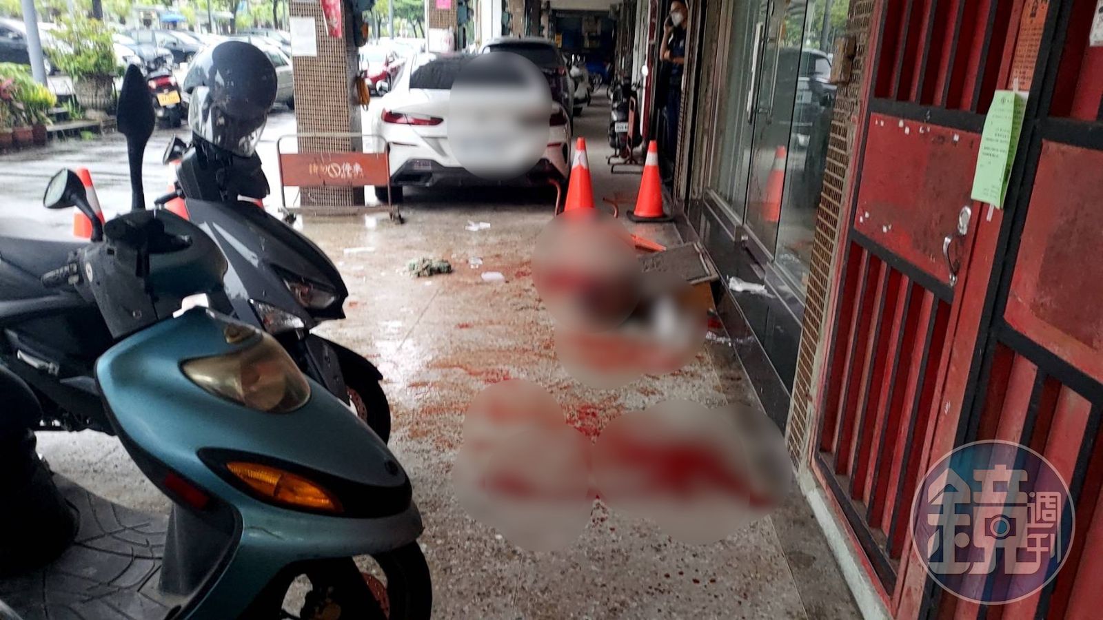 白男持刀砍殺李男,造成騎樓滿地是血。(翻攝畫面)警方調查,案發現場是一處四層樓公寓,白男與李男互不認識,今午,李男在公寓騎樓大呼小叫,引來住在樓上的白男不滿,持武士刀下樓理論,雙方互嗆,白男竟拿刀砍傷李男左前臂及後背,腹部還有穿刺傷,造成騎樓滿地都是血跡,激烈爭吵也讓附近民眾聞聲報警。