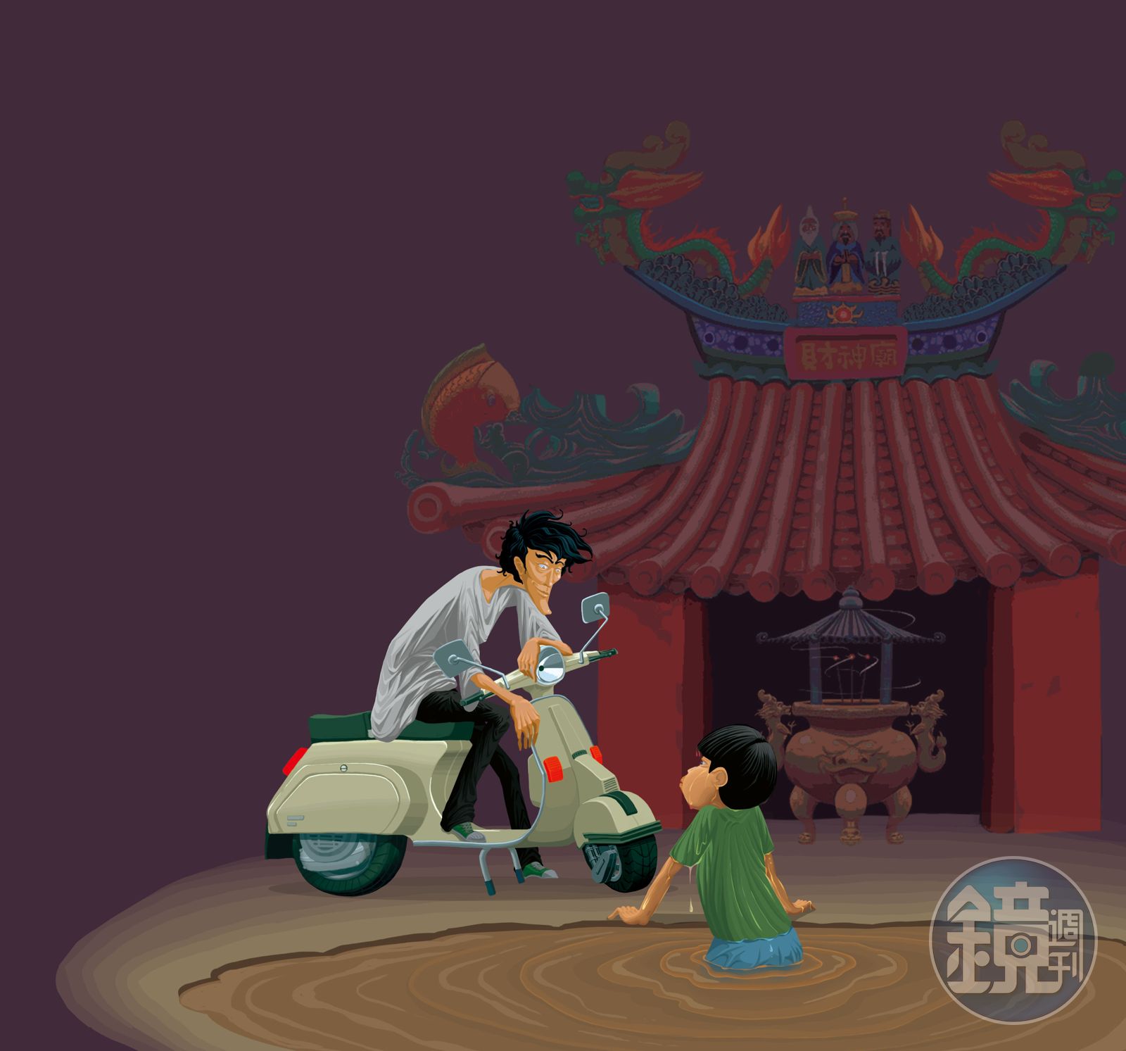 沒等素麗說完話,東毅狂奔出門,每個人下山前都得先去鳳凰潭旁邊的開山廟拜拜,東毅沿著湖畔衝刺,用力祈禱自己能趕上,老師雖然很厲害,但一定也需要拜拜的吧,正當東毅這麼想著,便看見汪昊騎上他的偉士牌,在廟口準備離開。