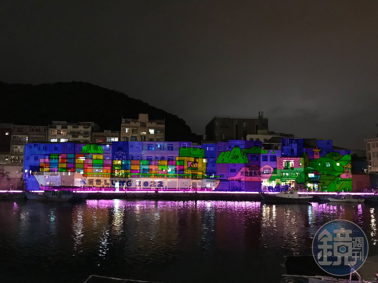 首先登場的《海派浪漫光雕秀》以正濱漁港色彩屋為布幕,3分鐘的投影光雕秀中,燈光沿著屋簷打亮,展現大船入港、鯨魚緩緩游過、貓咪搖動尾巴賣萌等光影畫面,為基隆夜晚增添童趣氣息。