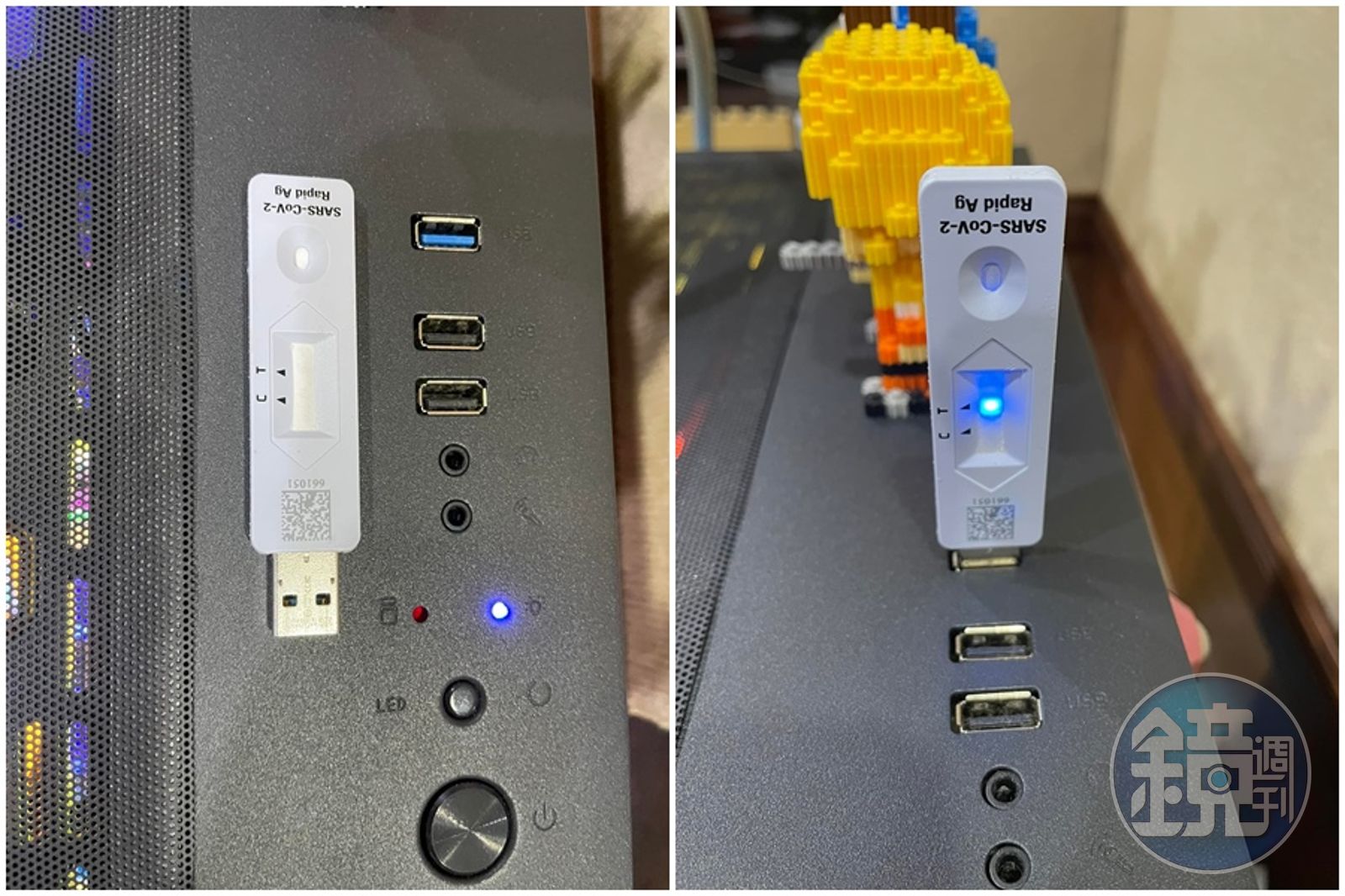 還有網友表示,「好有才~與病毒共存的第一步就是用的到的東西都要跟Covid-19有關」「主機也要驗快篩」「電腦快篩,看有沒有木馬病毒嗎?哈哈哈」「然後發現電腦確診」「下次會不會出現快篩悠遊卡」「亮兩顆燈就慘了😂」「插久兩條線的話表示過熱,不錯欸」「這明明是防毒軟體,插入顯示二條線表示中毒了😂」「怎麼製作的教一下」。