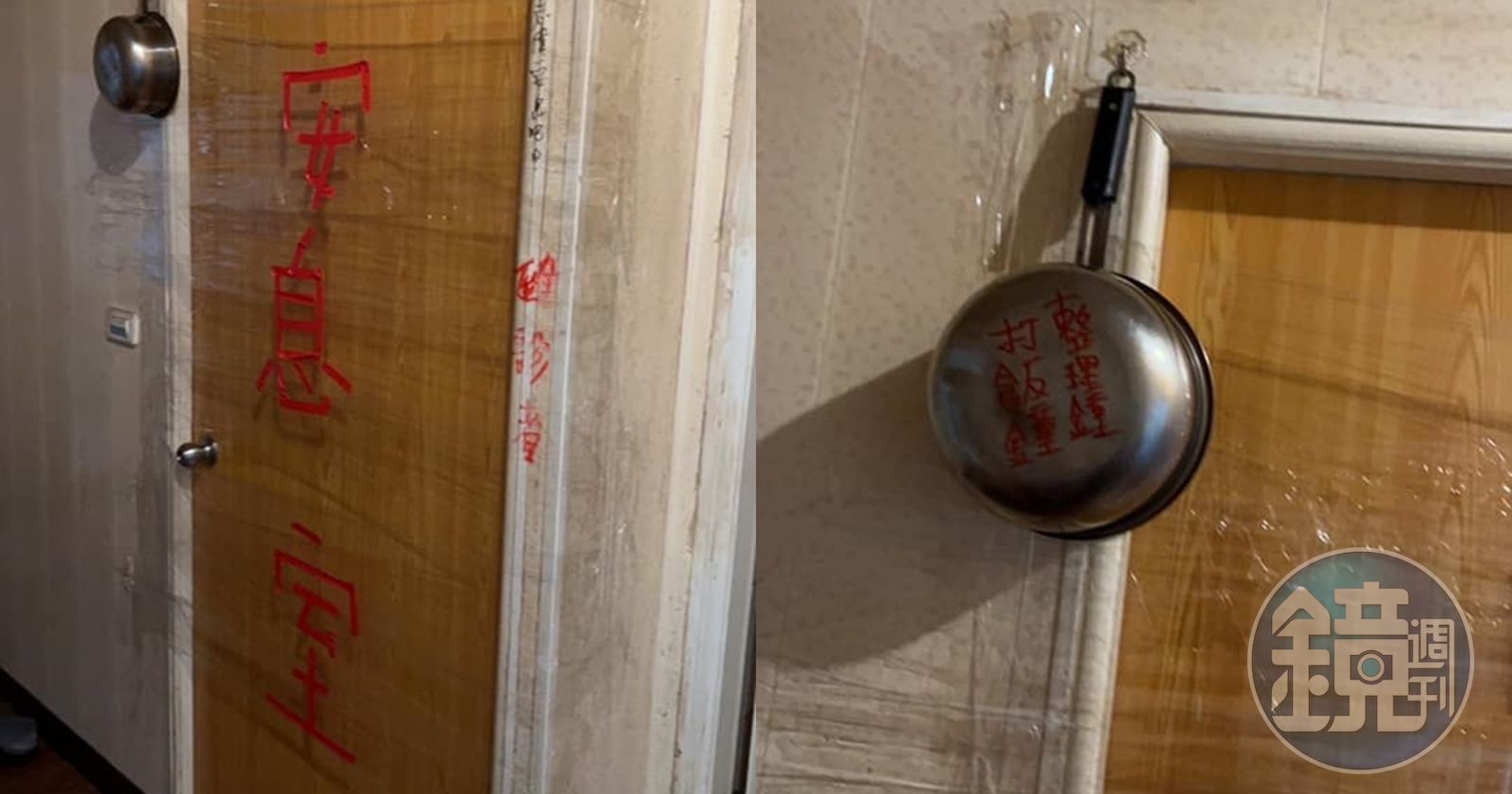 一名網友就在臉書社團「爆廢公社」分享2張照片,表示他同事確診在家隔離,隔離房門卻被透明膠帶封住,上頭還用紅色膠布貼上「安息室」3個大字,更有趣的是,房門口還掛著一個鐵鍋,鍋底用紅筆寫著「打飯鐘」「整理鐘」,似乎是用敲鍋來提醒房內的確診者該吃飯、該收拾垃圾了。
