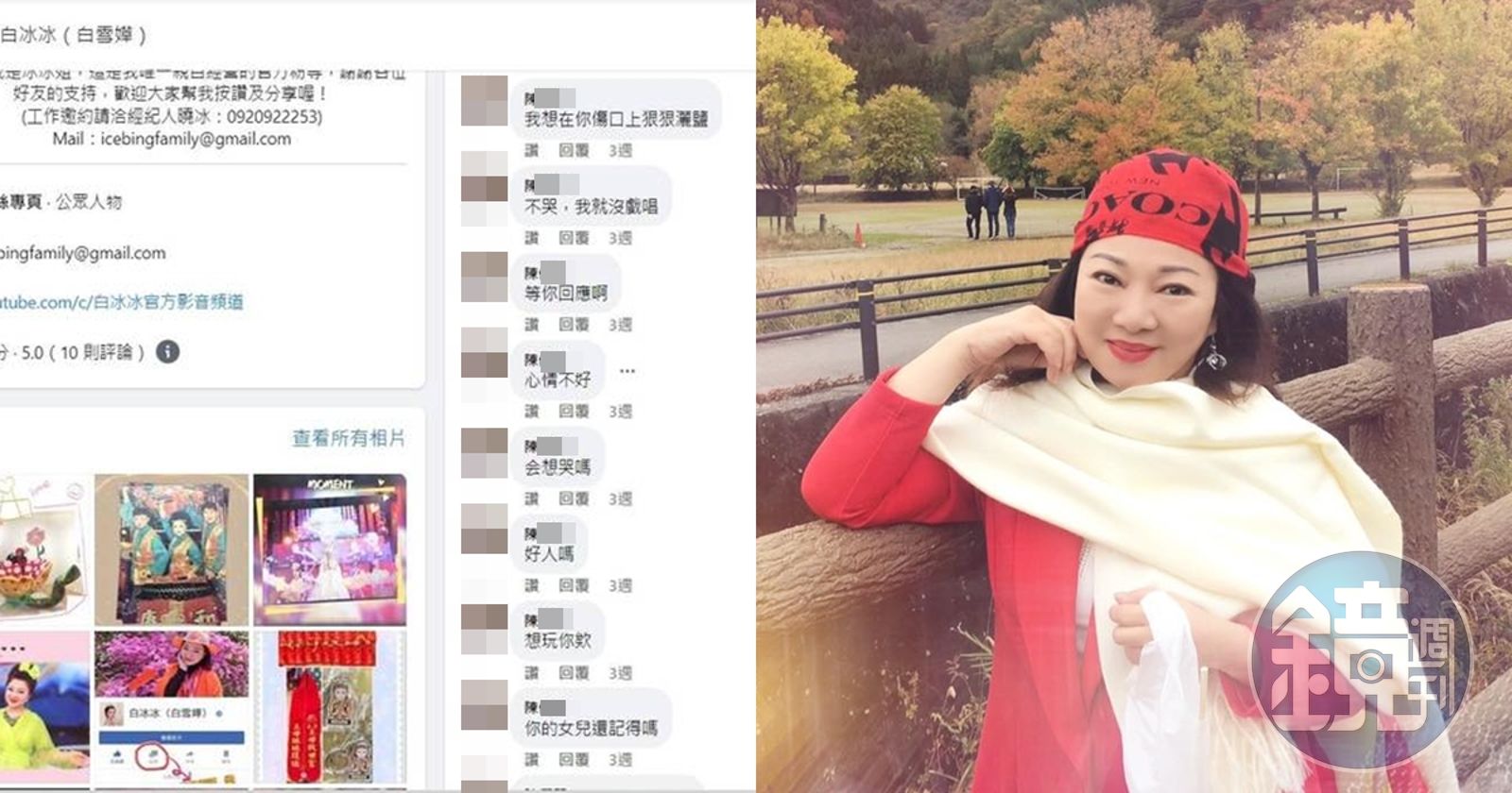 綜合媒體報導,白冰冰在上月14日發現自己的臉書粉專有不明人士惡意留言,「我想在你傷口上狠狠灑鹽」「想玩你欸」「你的女兒還記得嗎」「你女兒會平平安安」等語,甚至私訊白冰冰揚言「我要殺死妳」,讓白冰冰深感恐懼,趕緊到林口警分局報案。