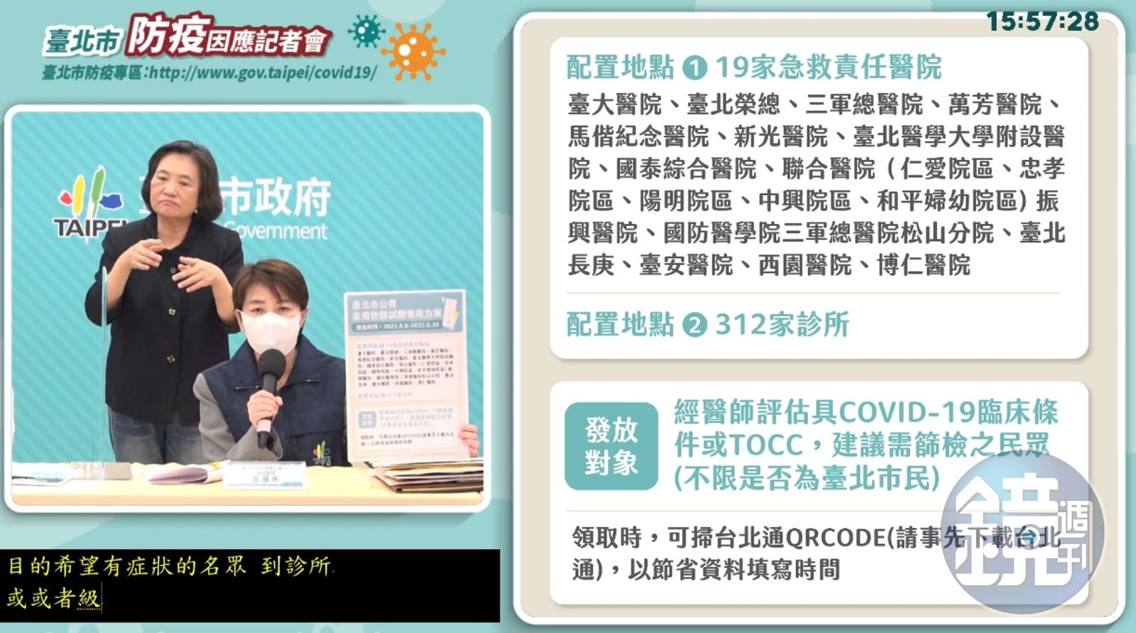 黃珊珊表示,為提供更便利的管道取得快篩試劑,今起實施公費家用快篩試劑領用方案,將在北市19家急救責任醫院及312家指定診所,配發公費快篩劑,只要經醫師評估具COVID-19臨床條件或有TOCC,建議需要篩檢的人,不限定是否為台北市民。