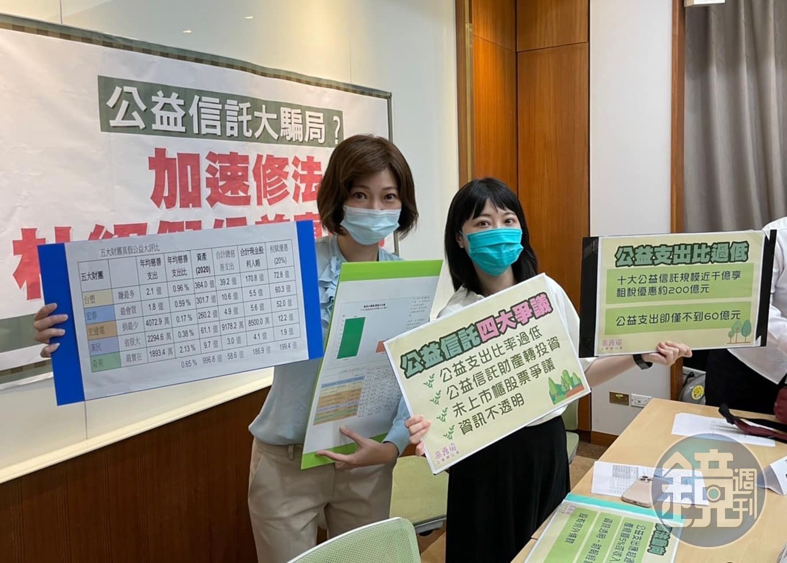 高嘉瑜和邱顯智召開「公益信託大騙局?加速修法杜絕假公益真避稅」記者會,高嘉瑜痛批,公益信託成財團的避稅天堂,公益性蕩然無存。
