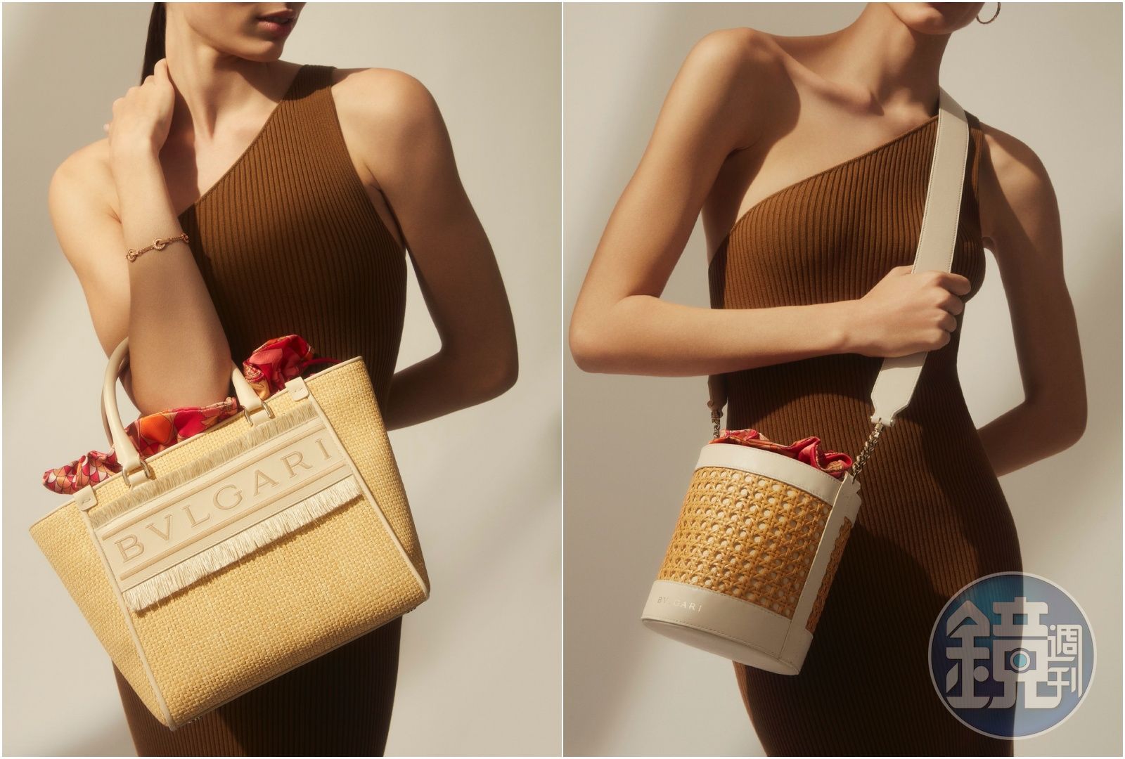 (左起)BVLGARI LOGO拉菲亞草編托特包,NT$75,900、Serpenti Forever藤編水桶包,NT$65,600。(寶格麗提供)發布時間:2022.06.09 17:26 臺北時間