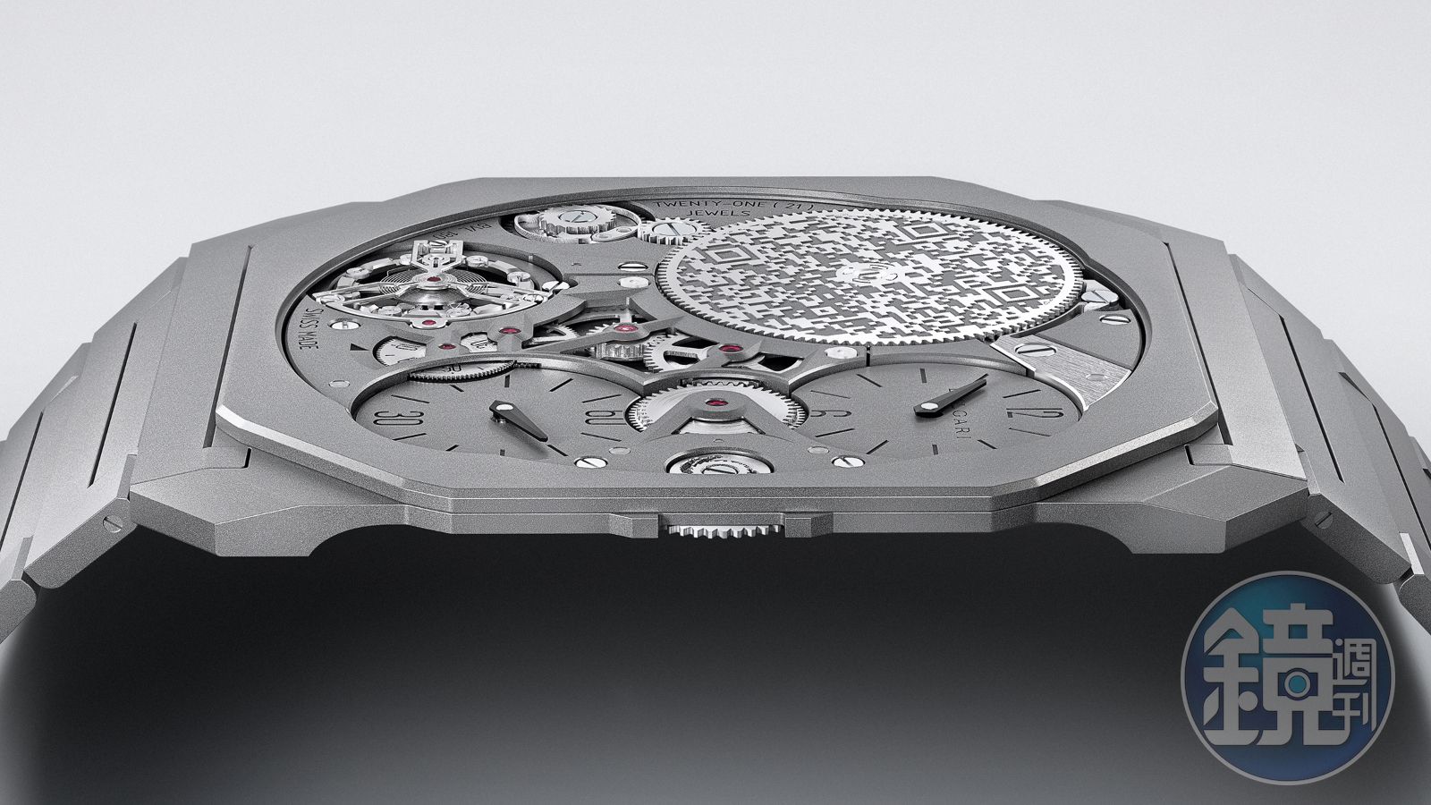而除了擁有複雜工藝,寶格麗也是錶壇中最具「當代設計觀點」的品牌。舉例來說,在今年這款Octo Finissimo Ultra的面盤,設計師利用發條盒寬闊的面積於其上以雷射技術鐫刻了QR Code。這是貨真價實的數位連結,小心喔,如果你拿智慧手機拍攝,會自動掃描到QR Code而連結到錶款製作工序與機芯虛擬3D導覽的網站呢!另外,寶格麗也已進入NFT世界,為買到這款Octo Finissimo Ultra的十位收藏家,打造專屬的NFT限量藝術品。