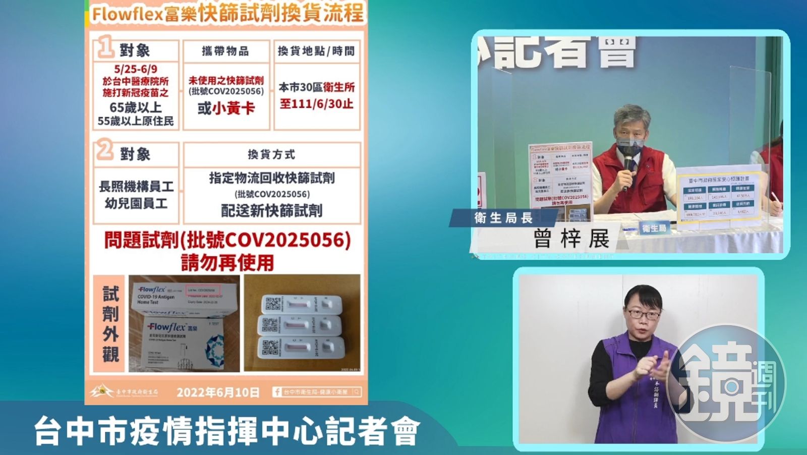 台中市發放的快篩試劑出問題,市府公布問題批號及換貨流程。(翻攝臉書直播畫面)發布時間:2022.06.10 17:28 臺北時間