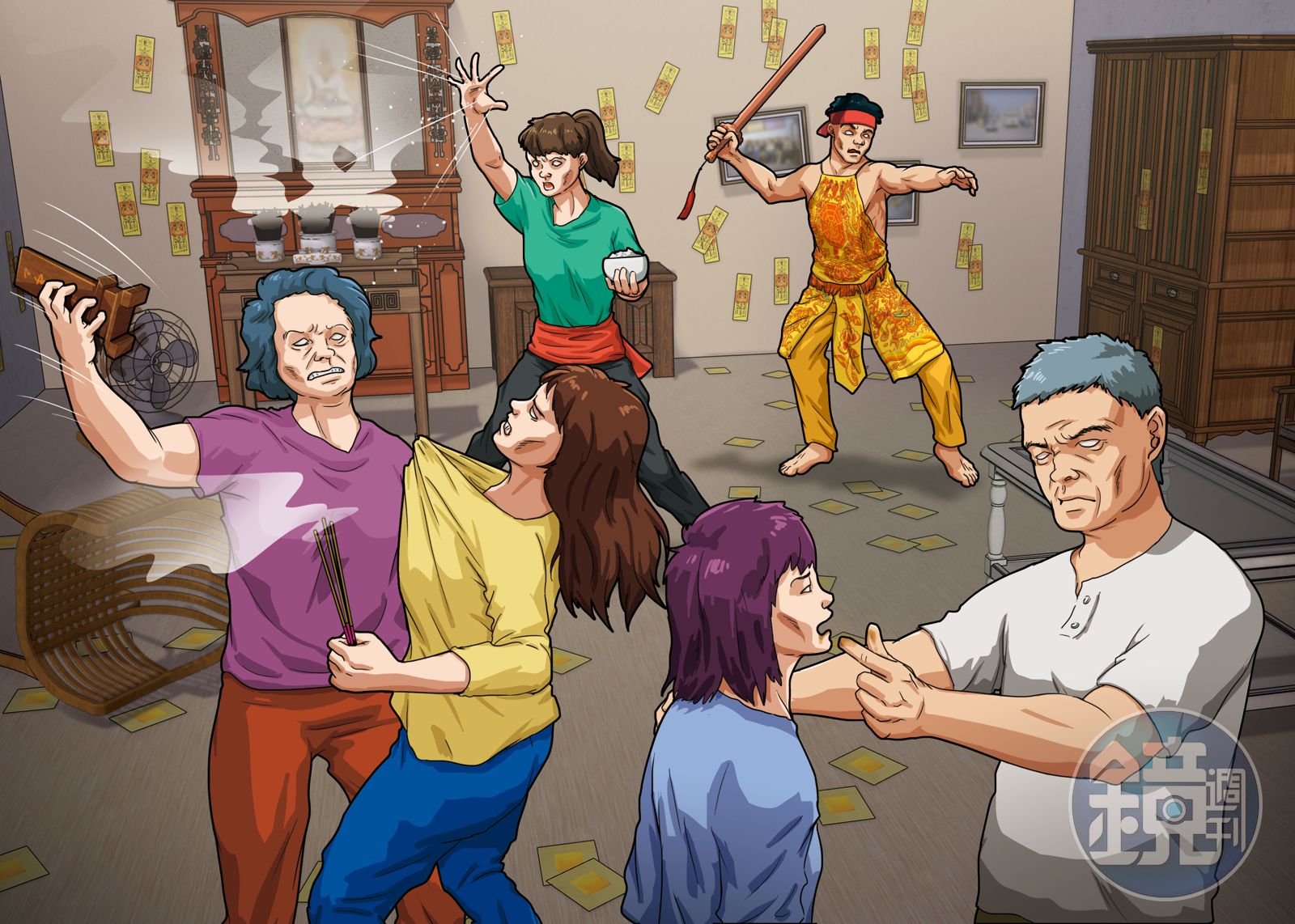 之後,吳父又找法師到家中看風水,法師除了移動幾尊神像,還要吳父燒毀其他神像,並畫了幾道符,交代他把符燒成灰燼泡水給全家人喝下。但喝了符水的吳家人行為變得更怪異,他們不僅足不出戶,斷食一週也不覺得餓,甚至開始自殘,還拿起棍棒及神主牌互毆,更將整把香點燃後互戳身體。