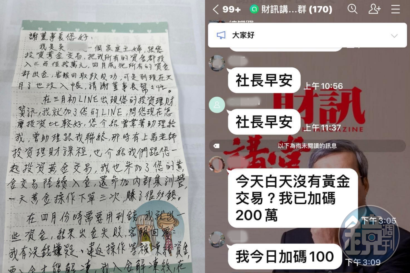 謝金河今在臉書分享一名來自桃園中壢的吳姓家庭主婦寄來的信件與群組截圖訊息,吳女聲稱,她3月初看到LINE上出現謝金河的投資群組,並且與一名名為「曾韋菁」的助理聯繫,學習投資黃金,不僅參加集訓營、起初還下單3次賺了不少錢。