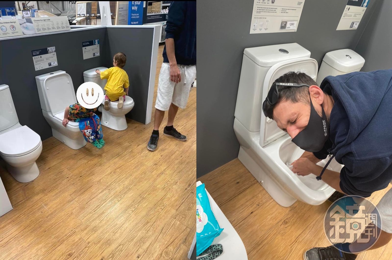 卡洛琳(Caroline Akhtar)在臉書發文表示,11日時她和老公在閒暇之餘帶著4歲長子雅各(Jacob)、3歲女兒法蘭琪(Frankie)及1歲女兒伊莉莎(Eliza)參觀特力屋,當卡洛琳轉個身去拿洗衣繩時,回頭發現雅各座在了展示的馬桶上。