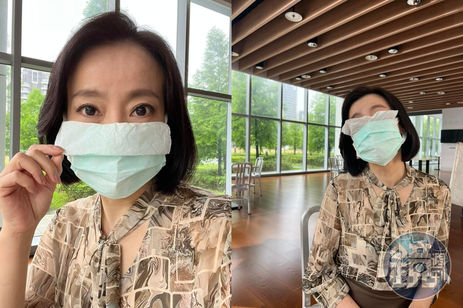 范瑞君在民視八點檔《黃金歲月》與排練場兩端跑,堅持口罩戴牢牢,只有上鏡頭時才脫口罩,但口罩戴久了難免臉上留下痕跡,而且妝會糊,鏡頭一拍、無所遁形,她還自行DIY研發零元無痕口罩,祕訣很簡單,就是在臉上先壓一張衛生紙、再戴上口罩,就能無痕還不脫妝,只是這造型看起來格外有喜感。
