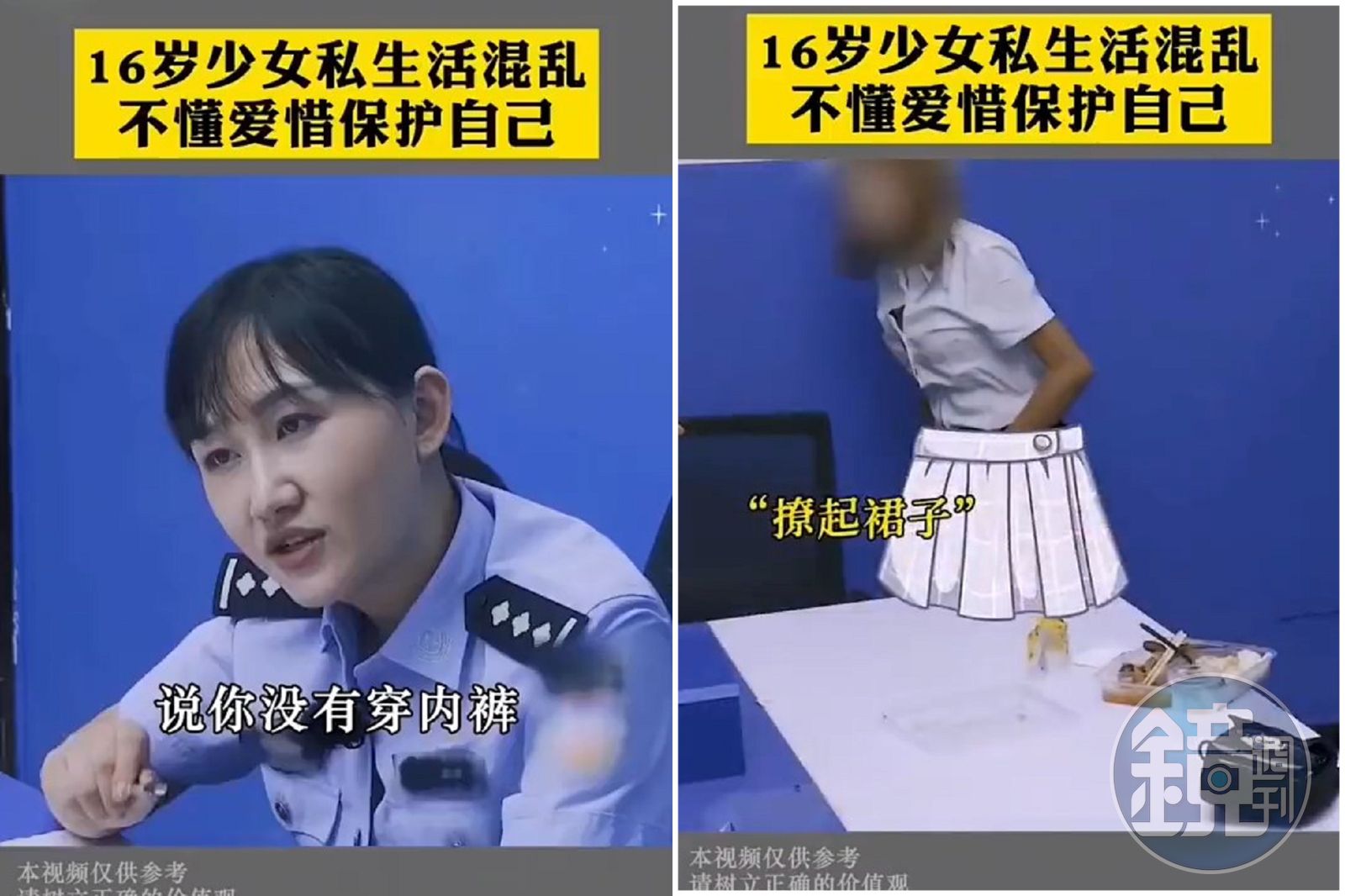 中國警方釋出的這段影片,主要是警惕青少年要好好保護自己的身體,避免淫亂私生活。影片可見一名16歲少女,由於缺乏性教育,導致她染上婦科疾病,也因為染病,所以無法穿內褲,女警得知她的狀況後,也驚喊:「說你沒穿內褲!」