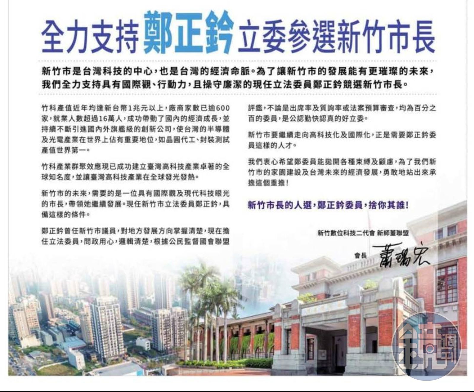 新竹數位科技二代會新師董聯盟會長蕭瑞宏在廣告中指出,鄭正鈐曾任新竹市議員,對地方發展方向掌握清楚,現在擔任立法委員,問政用心,邏輯清楚,根據公民監督國會聯盟評鑑,不論是出席率及質詢率或法案預算審查,均爲百分之百的委員,是公認勤快認真的好立委。