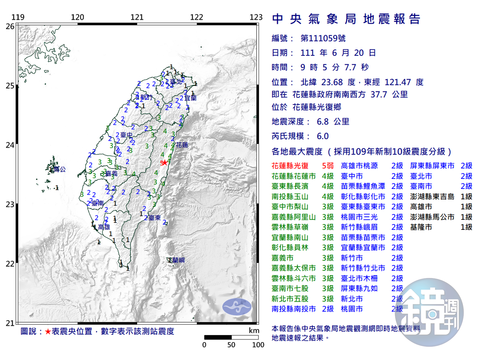 最大震度位於花蓮為5弱,台東縣、南投縣最大震度4級,台中市、嘉義縣、雲林縣、宜蘭縣、彰化縣、台南市及新北市為3級,高雄市、苗栗縣、桃園市、新竹縣及新竹市為2級,澎湖縣、基隆市則為1級。